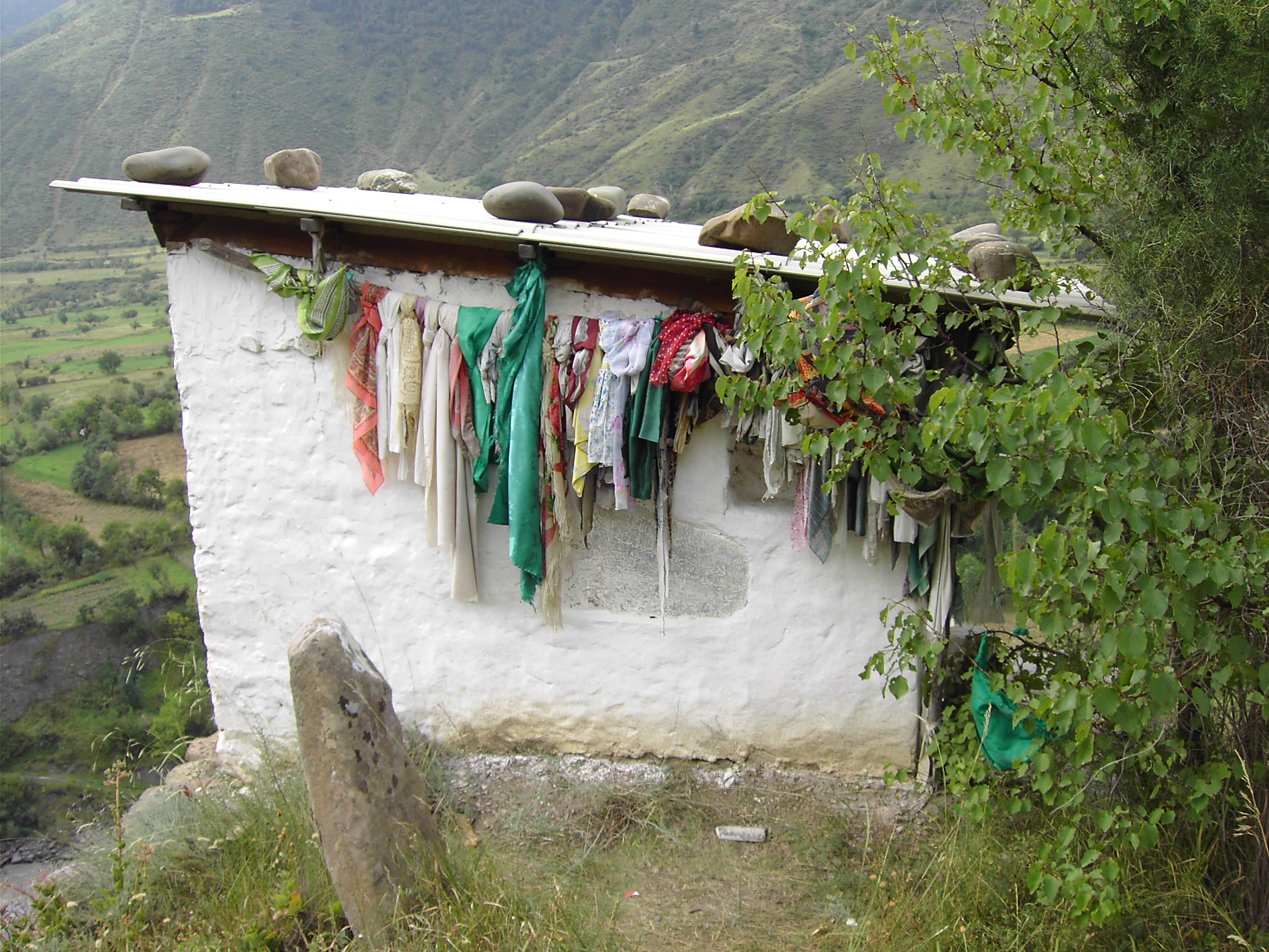 На восточной окраине Хрюга, в местности Мукьалал, прямо напротив впадения в Самур правого притока Юргъар-кам расположено обширное кладбище. На восточной окраине кладбища, на самом краю высокого крутого обрыва, ниспадающего к Самуру, находится почитаемое мусульманское святилище (пир), известное среди местных жителей под персонифицированным названием «суфи Ражабан пIир» («святилище суфия Раджаба») (Рис. 1, 2). Святилище с односкатной крышей представляет собой однокамерное, почти квадратное в плане каменное сооружение размерами 267х240 см. Высота стен – от 180 до 200 см. Низкий вход в пустую камеру расположен с западной стороны. Стены пира, как и многих других подобных сооружений Южного Дагестана, выбелены известью. В северной стене имеется небольшая глубокая ниша, предназначенная для милостыни (садака). Любопытно, что внизу, напротив пира, прямо под высоким обрывом, на обочине автомобильной дороги Магарамкент – Рутул, проходящей по левому берегу Самура, также имеется небольшое сооружение с традиционной нишей, куда желающими кладется милостыня. Это сооружение имеет непосредственное отношение к пиру суфия Раджаба. Подобные объекты, именуемые лезгинами термином къаншар («противоположная сторона; расположенное напротив»), обычно устраивались у дорог и предназначены для желающих прочитать молитву, совершить мольбу (ду‘а) или принести милостыню, не имея возможности совершить это непосредственно у пира, доступ к которому затруднен.