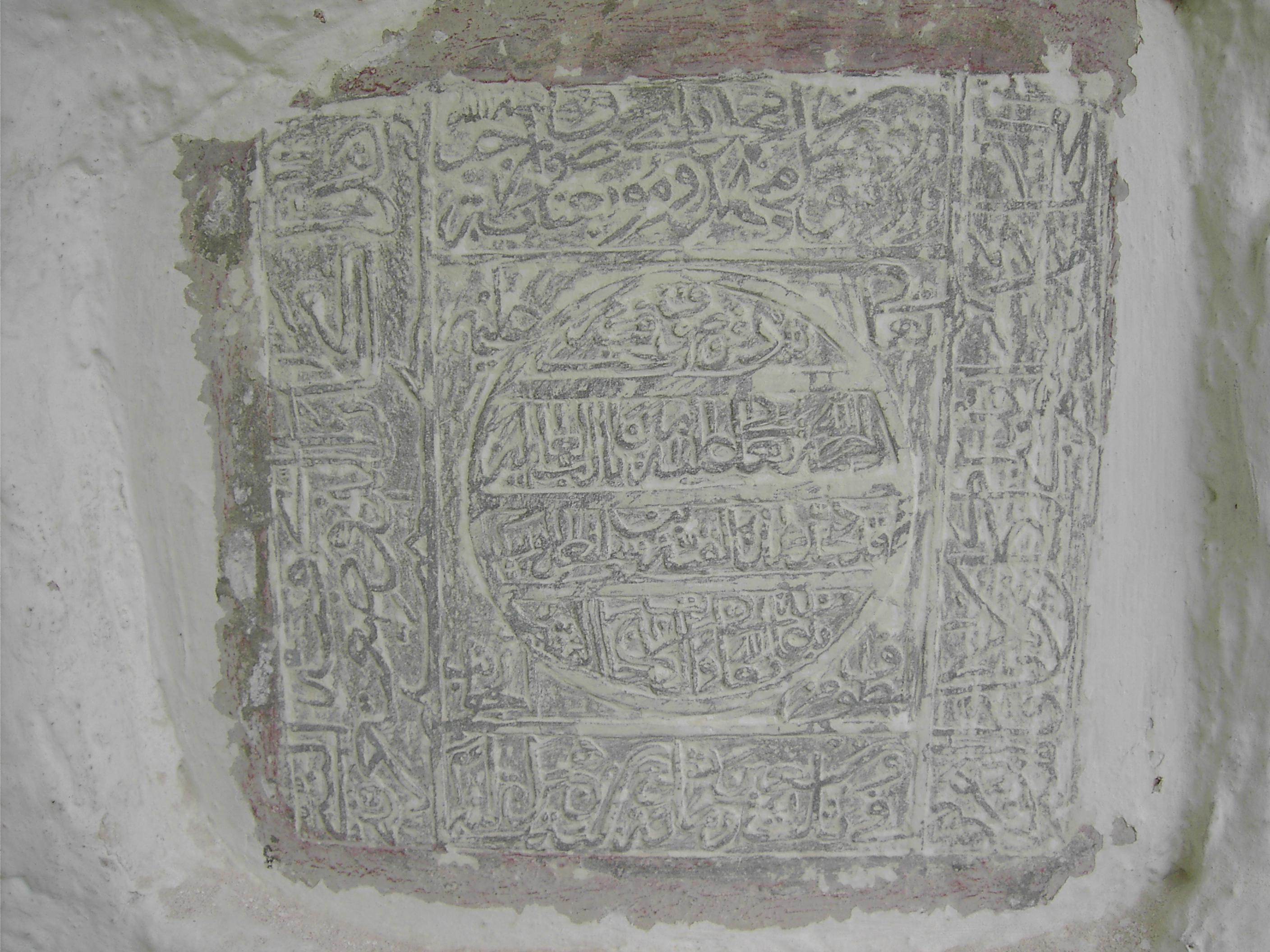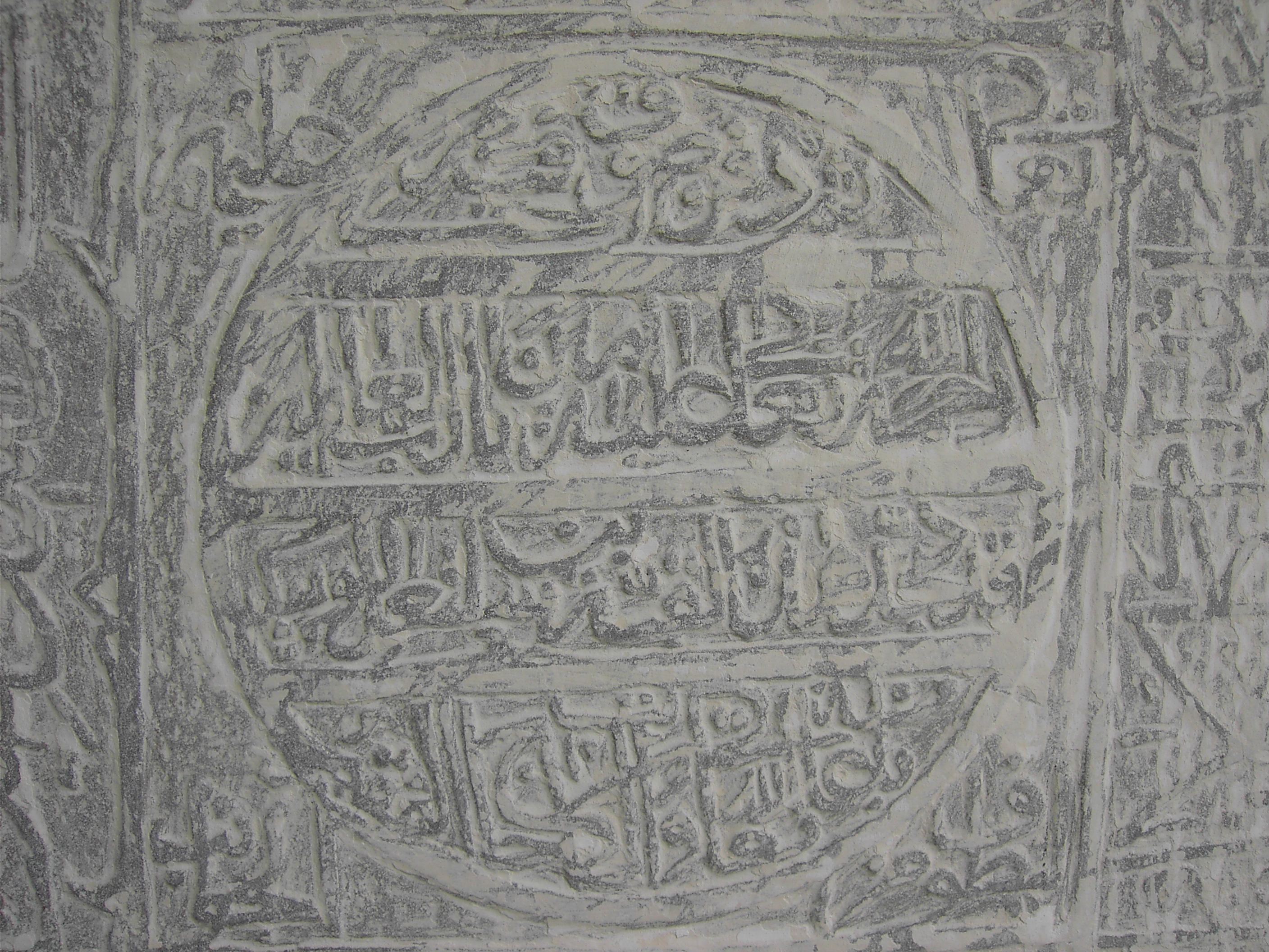 В западной стене святилища суфи Раджаба, слева от входа, вмонтирована каменная плита 49х45 см, сплошь покрытая рельефными каллиграфическими надписями (Рис. 5). Почерк – изящный сулс. По бордюру плиту окаймляет широкая эпиграфическая лента, а в центре расположено круглое поле, заполненное текстом из четырех строк. Надписи не имеют даты. По всей видимости, плита была изготовлена во второй половине XIX в.