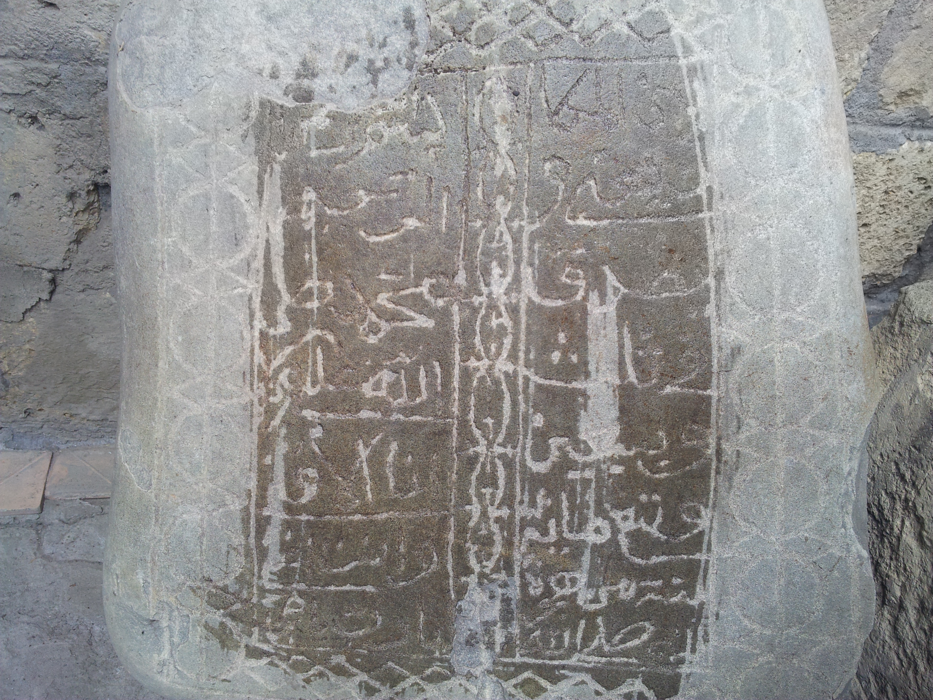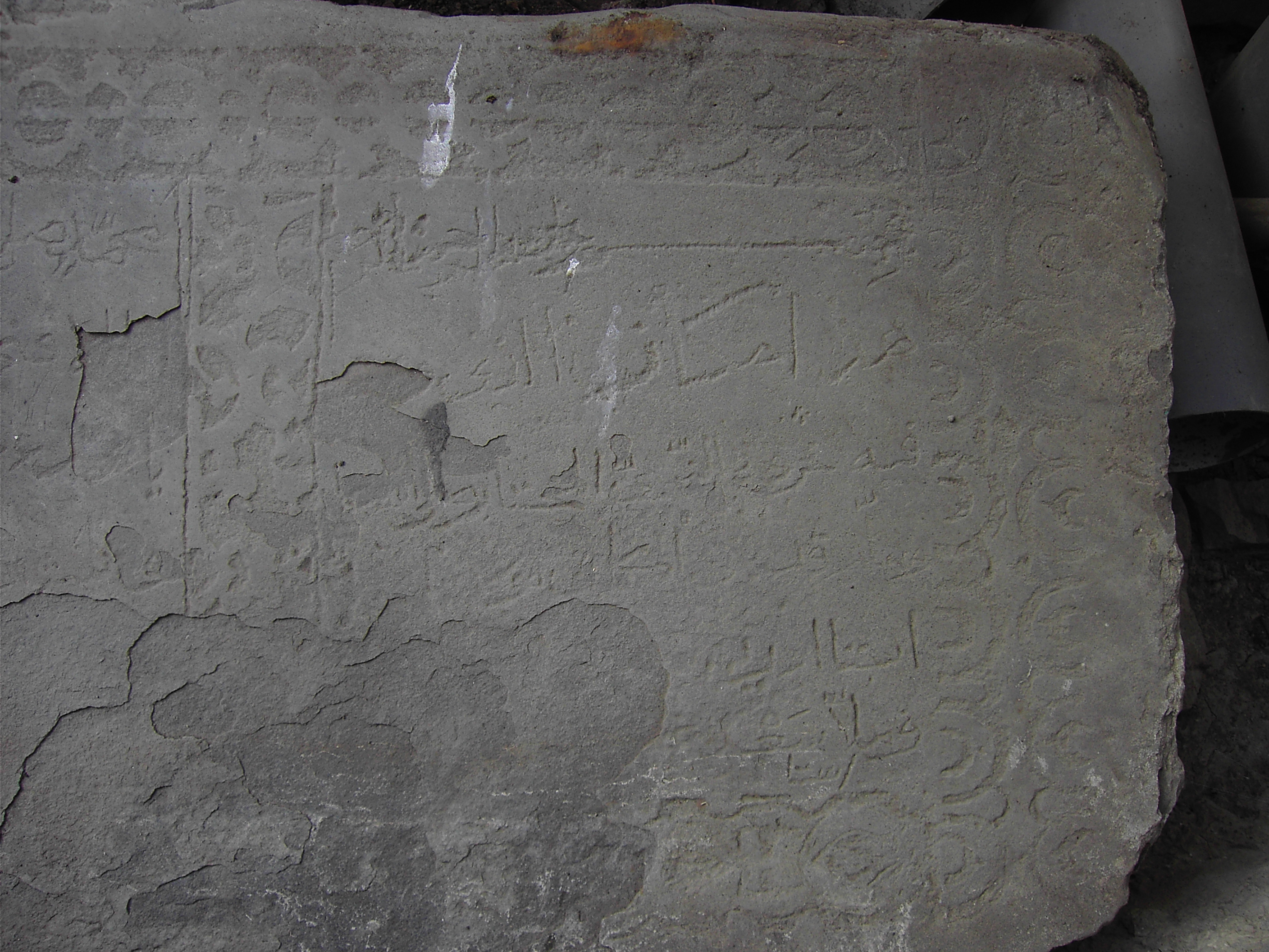 «1) Мухаммад – да благословит его Аллах и да приветствует! 2) Я – самый тленный, а Ты – самый богатый, о, Господь! 3) О, Мухаммад, – мир ему! Построено (бана) это место … в 4) девятьсот семьдесят третьем году 5) от хиджры пророка, – да благословит его Аллах 6) [и да приветствует]».