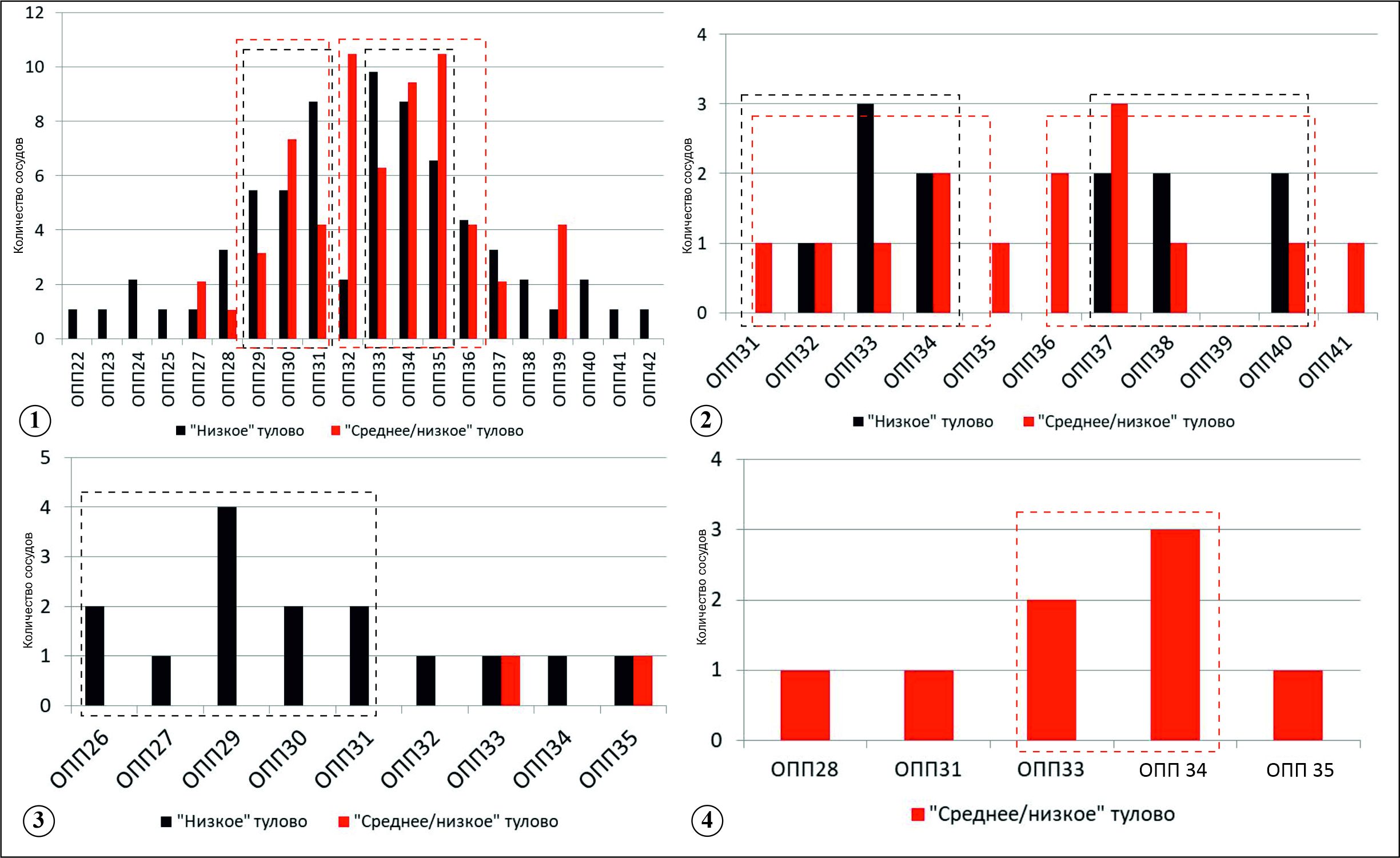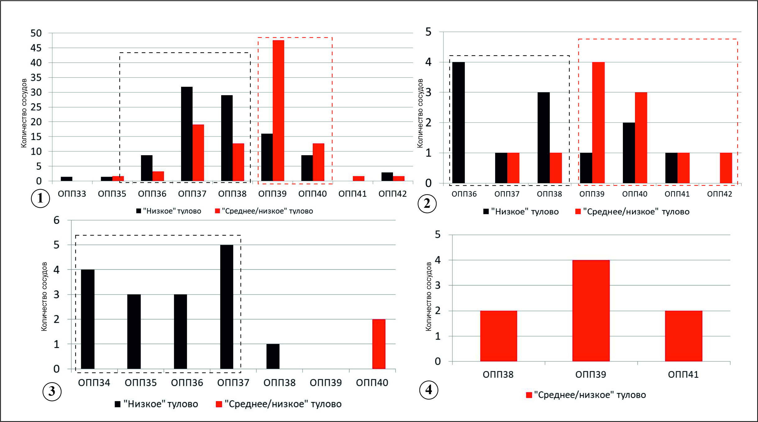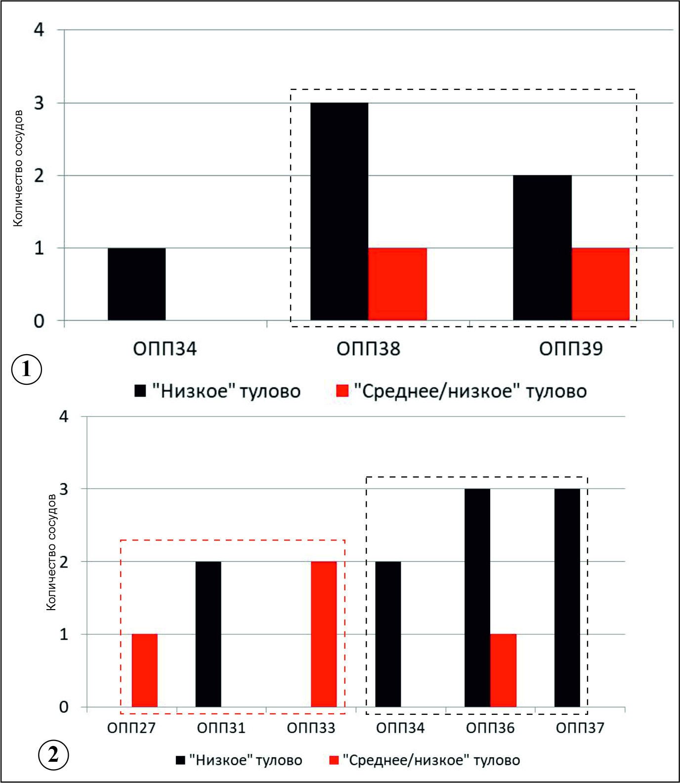 Исходя из полученных данных, можно сделать вывод, что для кувшинов с «низким» и «средним/низким» туловом характерна разная ОПП всего сосуда. Для первых это ОПП ступеней 37‒38, для вторых ОПП ступени 39, на которую приходится выраженный пик распределения.