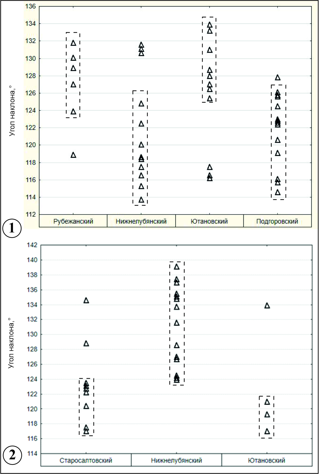 Различие между двумя обозначенными группами памятников выглядит ещё более существенным, если сравнить их по абсолютным значениям угла наклона П-ПП (рис. 6)4 При сравнении кувшинов с «низким» туловом образуются две пары (рис. 6, 1). Первая – Рубежанский и Ютановский могильники. Интервал наиболее плотного распределения значений находится примерно в пределах 124/125 – 132/134°. Вторая пара памятников – Нижнелубянский и Подгоровский могильник. Здесь интервал наиболее плотного распределения значений находится примерно в пределах 114/115 – 125/126°. Если сравнить памятники по углам наклона П-ПП у кувшинов со «средним/низким туловом» (рис. 6, 2), то хорошо видны различия между парой Старосалтовский-Ютановский и Нижнелубянским могильником. В Нижних Лубянсках наибольшая плотность значений приходится на интервал 124–140°, а в Старом Салтове и Ютановке на интервал 117–124°.