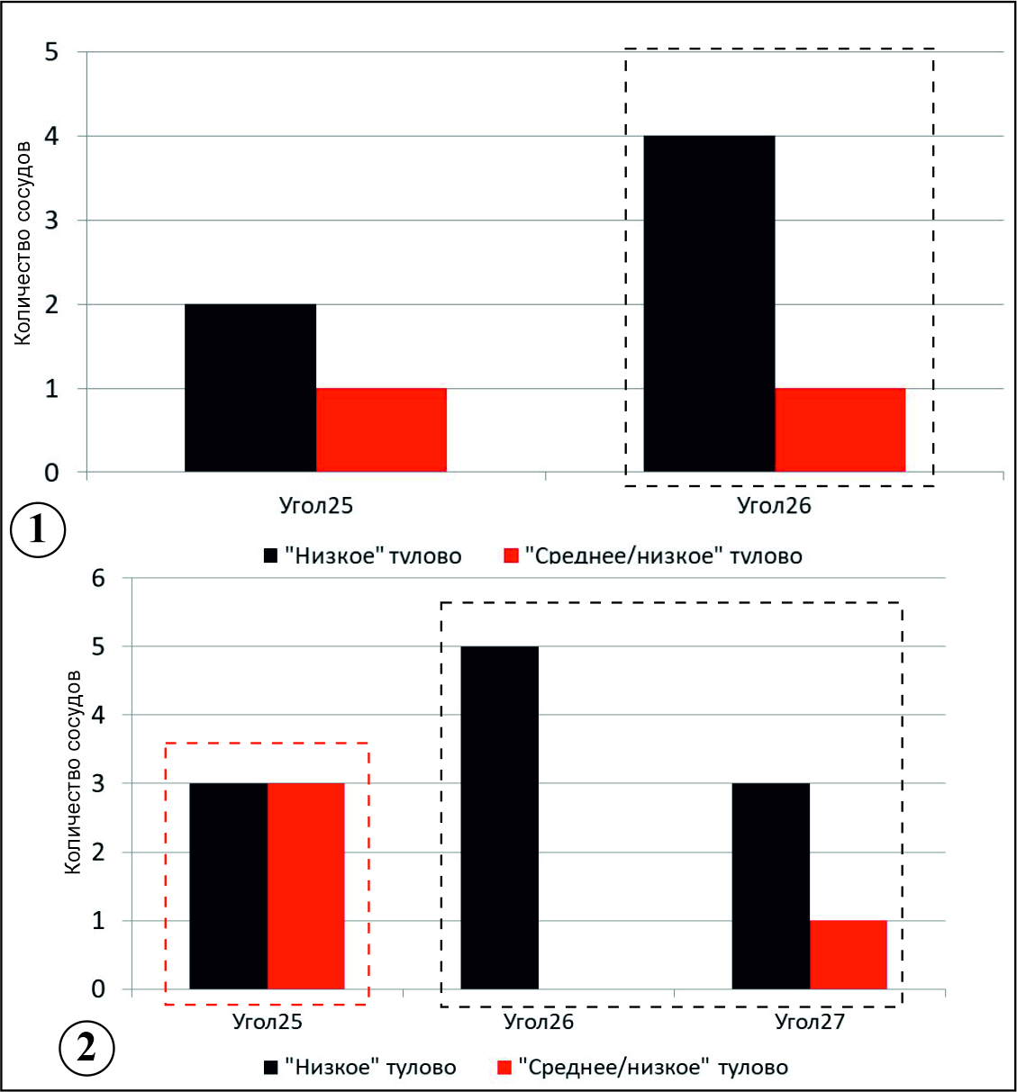 Ютановский могильник (рис. 5, 2). Кувшины с «низким» туловом показывают распределение, близкое к нормальному: по 3 сосуда относятся к ступеням 25 и 27, 5 сосудов – к ступени 26. Большинство кувшинов со «средним/низким» туловом (3 из 4 сосудов) соответствуют 25 ступени, а один – 27 ступени.
