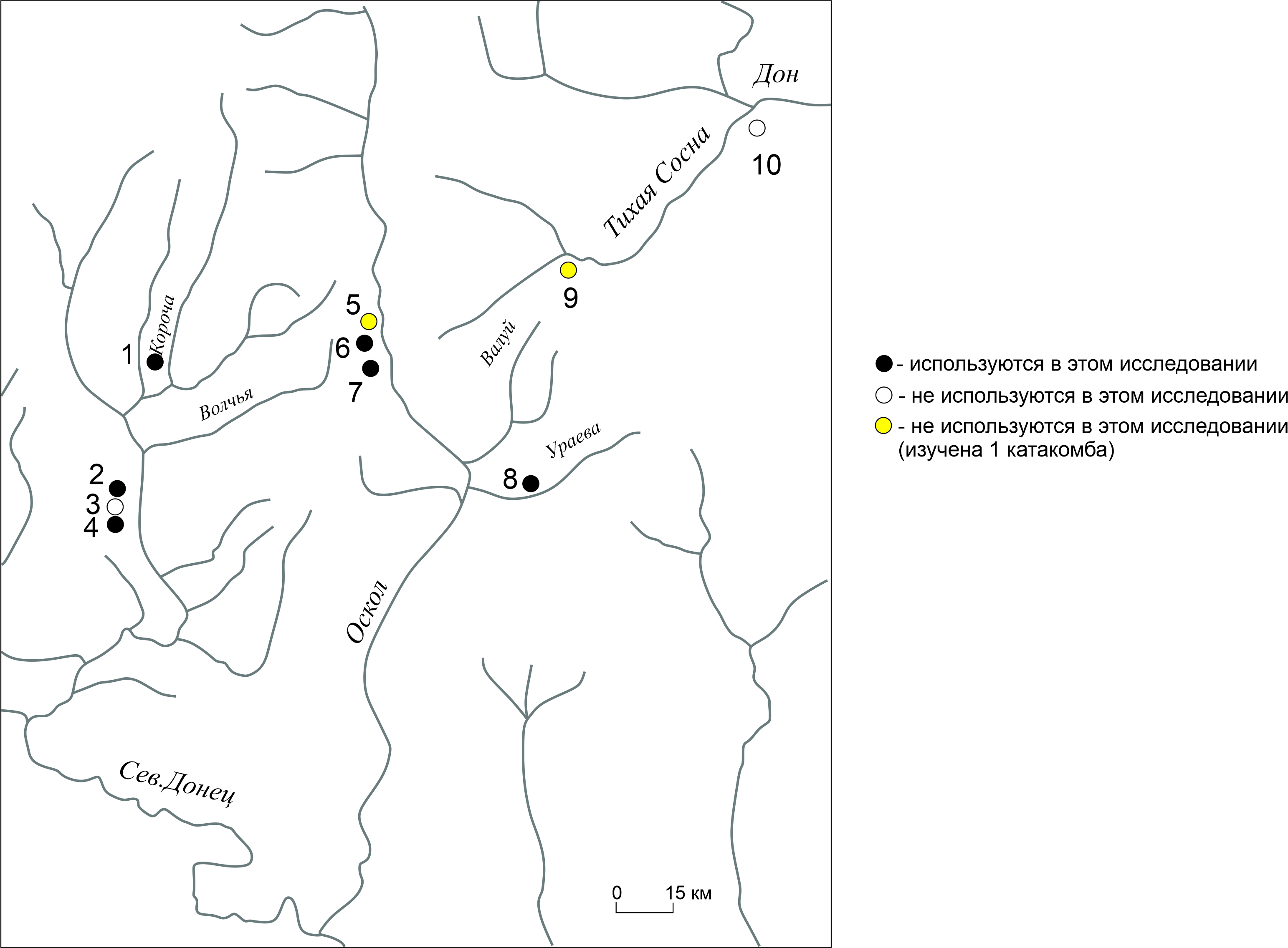 В статье рассматриваются доступные автору материалы салтово-маяцких памятников, расположенных в долинах рек Северский Донец и Оскол. Это микрорегионы с наибольшей плотностью погребальных памятников салтово-маяцкой культуры в донской лесостепи. Здесь известно 8 катакомбных могильников. Из них в работе использованы материалы 6 (рис. 1), кроме Афоньевского и Верхнесалтовского могильников. На Афоньевском могильнике изучена только одна катакомба. Материалы Верхнесалтовского могильника в большинстве своем не доступны для полноценного изучения. Этот вопрос уже обсуждался в литературе [3, c. 82]. Верхнесалтовский археологический комплекс, расположенный на территории Харьковской области, включает несколько катакомбных некрополей. Так сложилось, что для изучения сегодня доступны в основном материалы относительно недавних раскопок, но в настоящее время это сделать невозможно. Некоторые катакомбы, раскопанные на Верхнесалтовском могильнике, благодаря усилиям В.С. Аксёнова, постепенно вводятся в научный оборот. Однако совершенно очевидно, что тот небольшой объем керамического материала, который