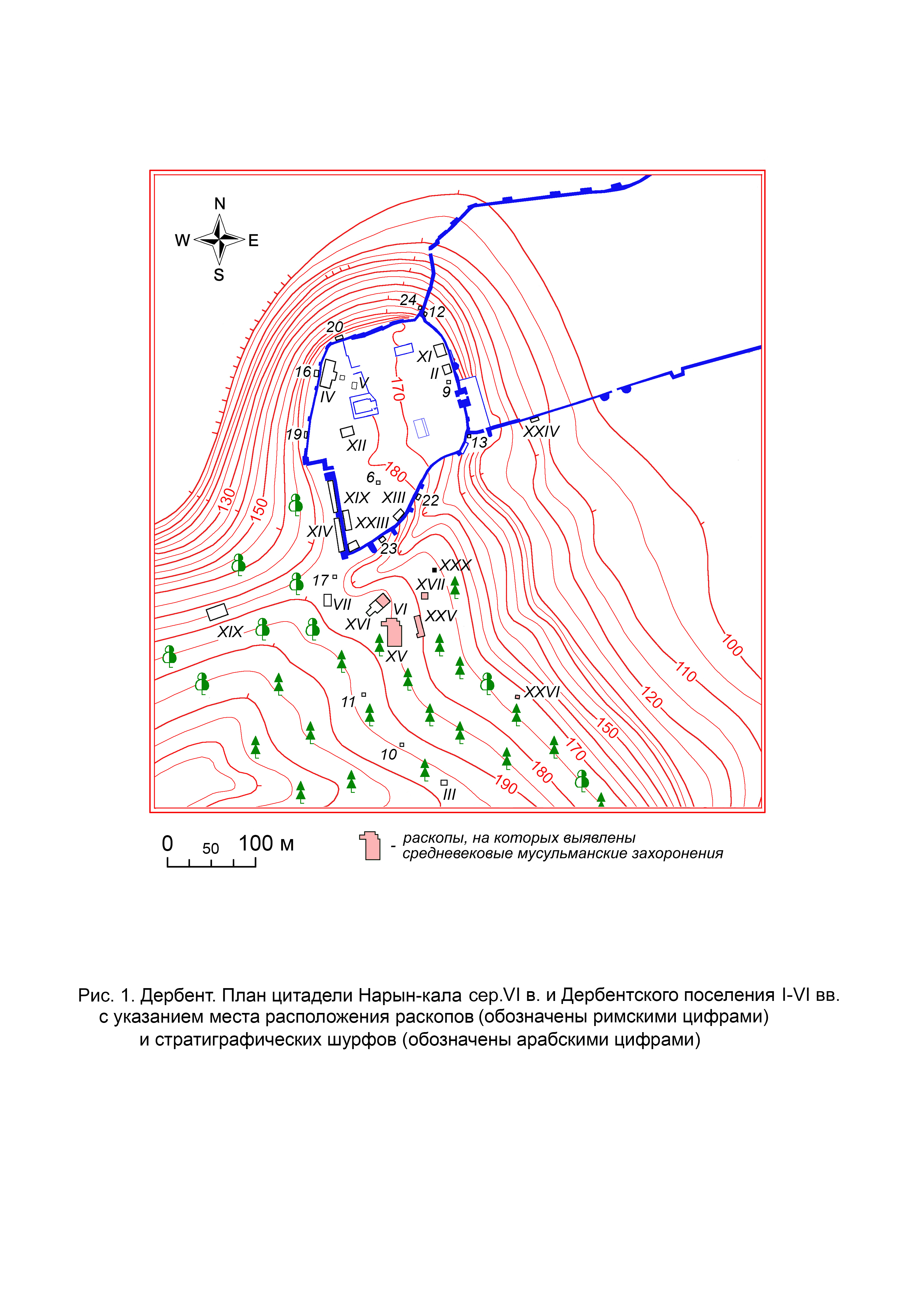 Во время исследований на территории Дербентского поселения албано-сарматского и сасанидского времени (I–VI вв. н.э.), расположенного к югу от цитадели Нарын-кала, на размещенных близ друг от друга раскопах VI (1977 г.), XV (1989 г.), XVII (1989 г.) и XXV (2012, 2013, 2015–2017 гг.) был открыт ранее неизвестный средневековый мусульманский могильник (рис. 1). На этих раскопах, находящихся на расстоянии 60–110 м к югу и юго-востоку от южной угловой башни цитадели Нарын-кала, было выявлено суммарно 71 мусульманское захоронение, которые были впущены в культурный слой поселения. На раскопе VI было открыто 20 захоронений [1, c. 125–129]. На раскопе XV – 13 захоронений1. На раскопе XVII было выявлено мусульманское захоронение в каменном ящике-цисте и упавшая надмогильная стела2. На раскопе XXV, расположенном в 90–110 м к юго-востоку от угловой башни цитадели Нарын-кала, в 2012–2019 гг. было обнаружено 37 захоронений [2, с. 155–156; 3, с. 220–223; 4, с. 94–95; 5, с. 139–140; 6, с. 259–260; 7, с. 268–269; 8, с. 292–293].