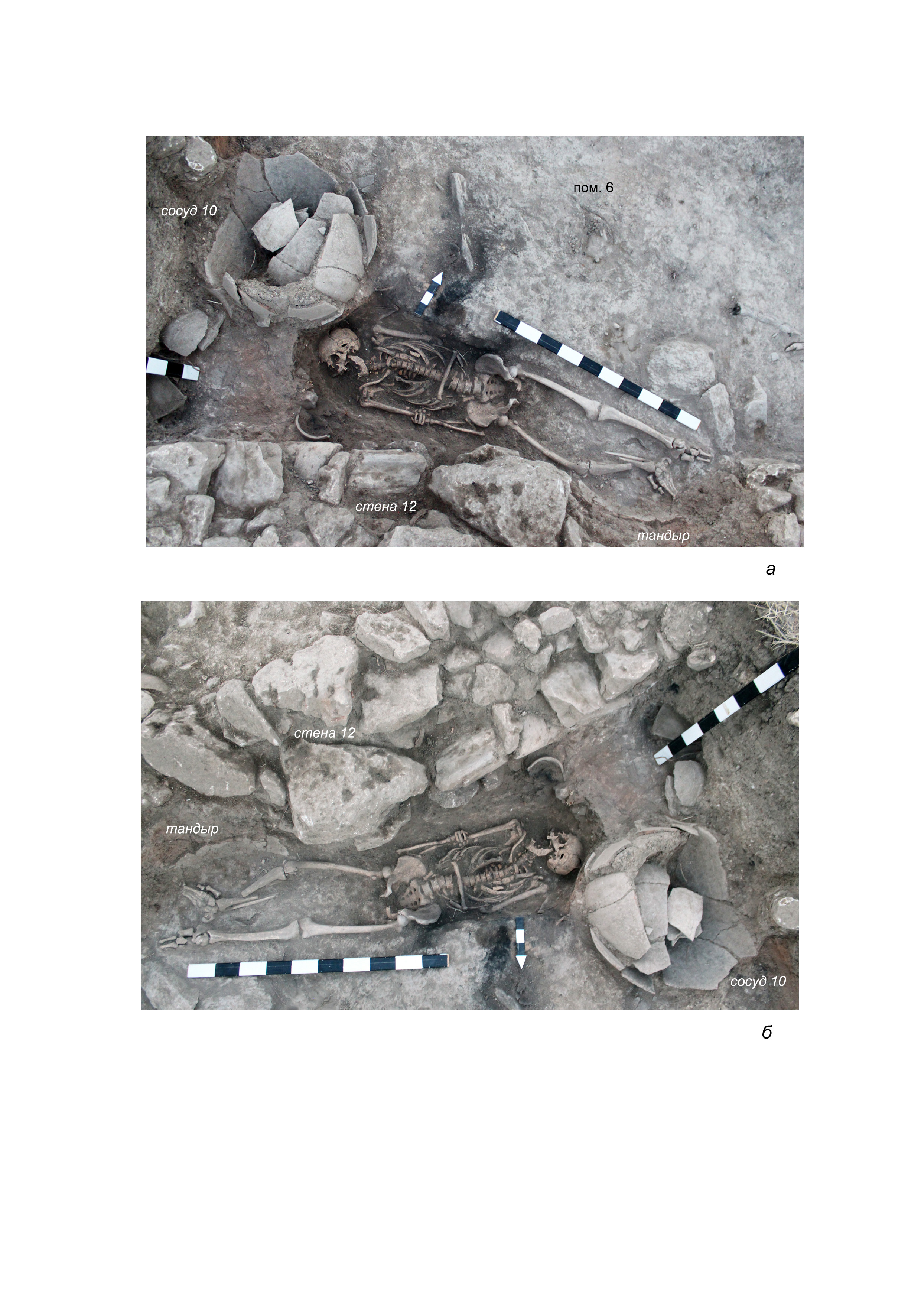 Среди исследованных захоронений особый интерес вызывает погребение 24, открытое на раскопе XXV в. в 2016 г. Он было выявлено в площади помещения 6 жилищно-хозяйственного комплекса, датируемого V веком н.э., и при этом, будучи впущенным в культурный слой, в значительной степени разрушило пристенный очаг-тандыр (рис. 2).