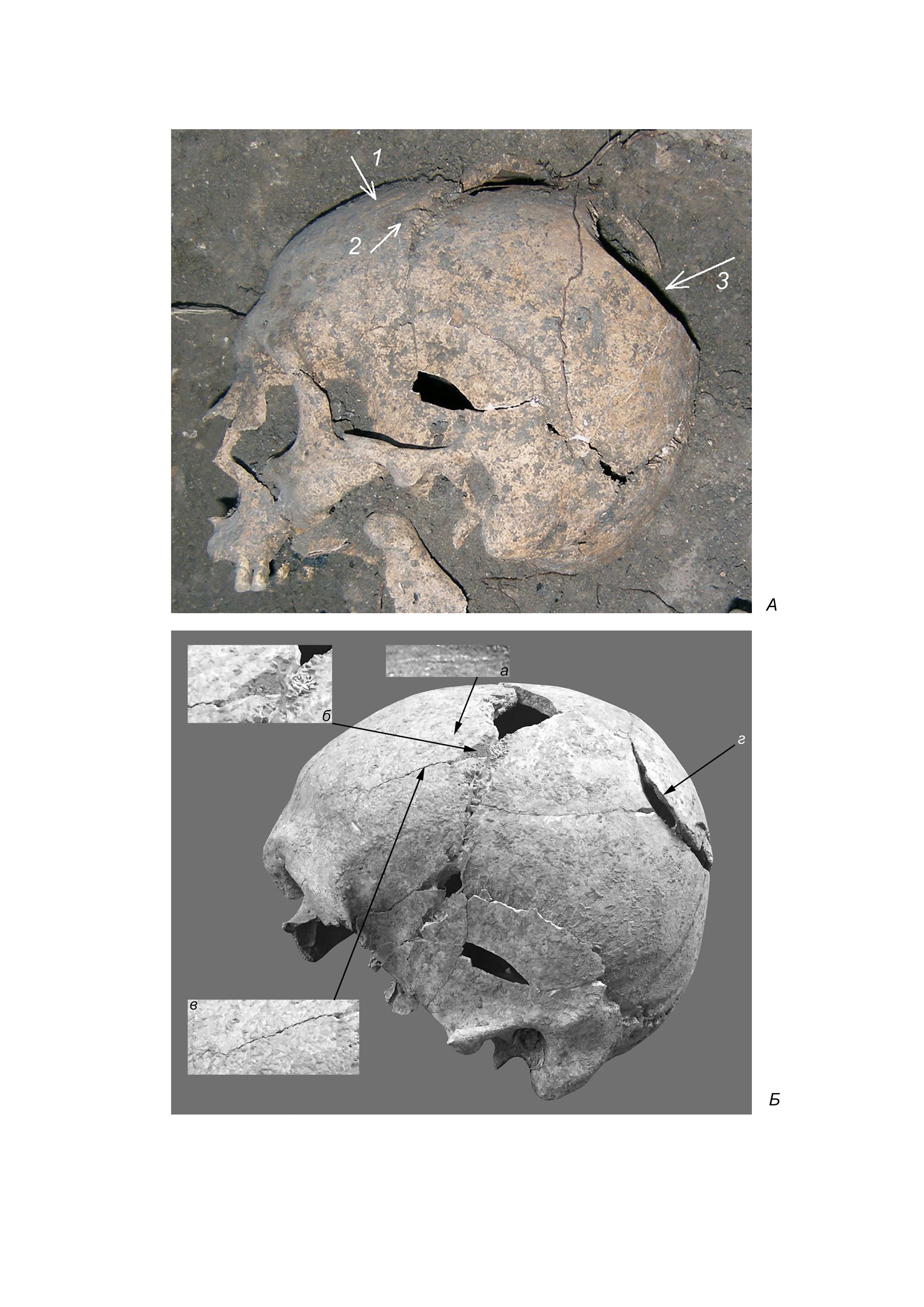 Так как череп и мозговая коробка были существенно деформированы посмертно, то их измерения не проводились. Визуально, мозговая коробка брахикранная, средневысокая и в целом соответствует по форме и размерам другим черепам из раскопа XXV. В левой части лобной кости присутствуют две травмы. Первая из них расположена в 25 мм от точки bregma (рис. 4А,1, 4Б,а) и представляет собой поверхностную, неглубокую короткую (25 мм) рану, нанесенную рубяще-режущим орудием (саблей) сверху. В 10 мм от первой раны, на пересечении с венечным швом, расположен след еще одной небольшой, несквозной, но более глубокой травмы, вероятно, нанесенной также ударом сверху, кончиком сабли (рис 4А,4, 4Б,б). Вероятно, удар был достаточно сильным и повлек за собой растрескивание черепной коробки в левой части лобной кости (рис. 4Б,в). Следы облитерации первой и второй травмы отсутствуют. Наконец, на левой теменной кости находится еще один длинный (около 100 мм) узкий след от сильного сквозного удара (рис. 4А,3, 4Б,г), нанесенного тонким рубяще-режущим орудием, пробившем теменную кость и вскрывшем черепную коробку. Следы зарастания этой травмы также отсутствуют. Вероятно, рана была нанесена перед смертью индивида и могла быть ее причиной. Судя по расположению, форме, длине и ширине «пореза» травма могла быть нанесена саблей сверху сбоку косым ударом – мужчина, возможно, находился в приклоненном положении вправо, что характерно для воина, прикрывающегося щитом в левой руке от удара, или лежал на правом боку. Характер, расположение и параметры травм позволяют прийти к заключению, что они являются единовременными, данные повреждения носят боевой характер и мужчина был погребен вскоре после полученных травм.