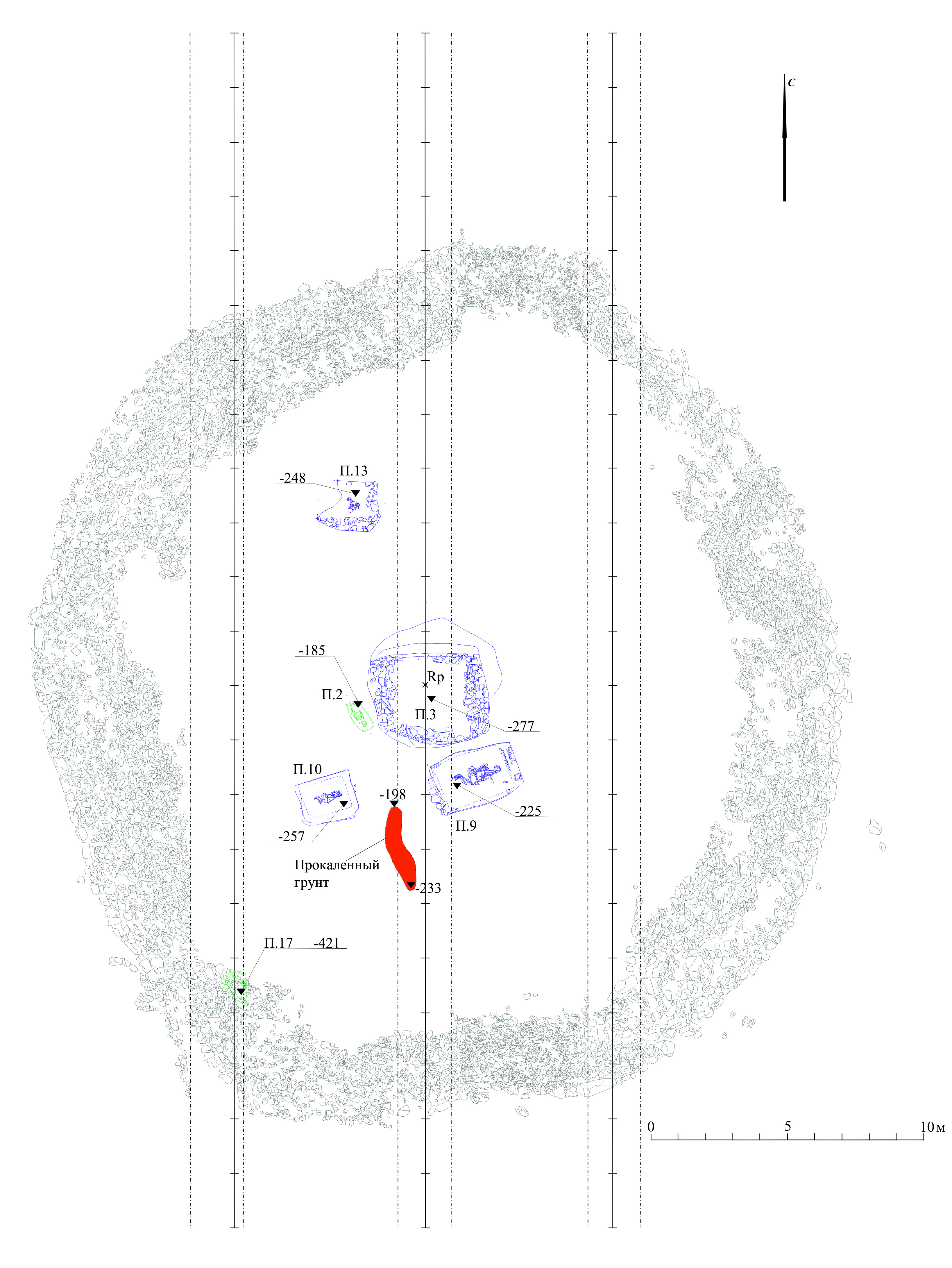 Burial 10 is identified as an intrusive burial located in the central part of the mound, positioned 5 m SW from the center. The burial pit has a rectangular shape oriented along the WSW-NE line, with dimensions measuring 1.9×1.6 m. The contour of the pit is disrupted in the southern and western parts. The walls are vertical, reaching up to 20 cm in height (Fig. 7, 12). The bottom is flat, sloping towards the WSW wall. The pit was filled with wood decay, ranging from 1 to 8 cm in thickness, originating from the ceiling boards that were laid perpendicular to the long axis of the pit, along with stones that were placed at the bottom.