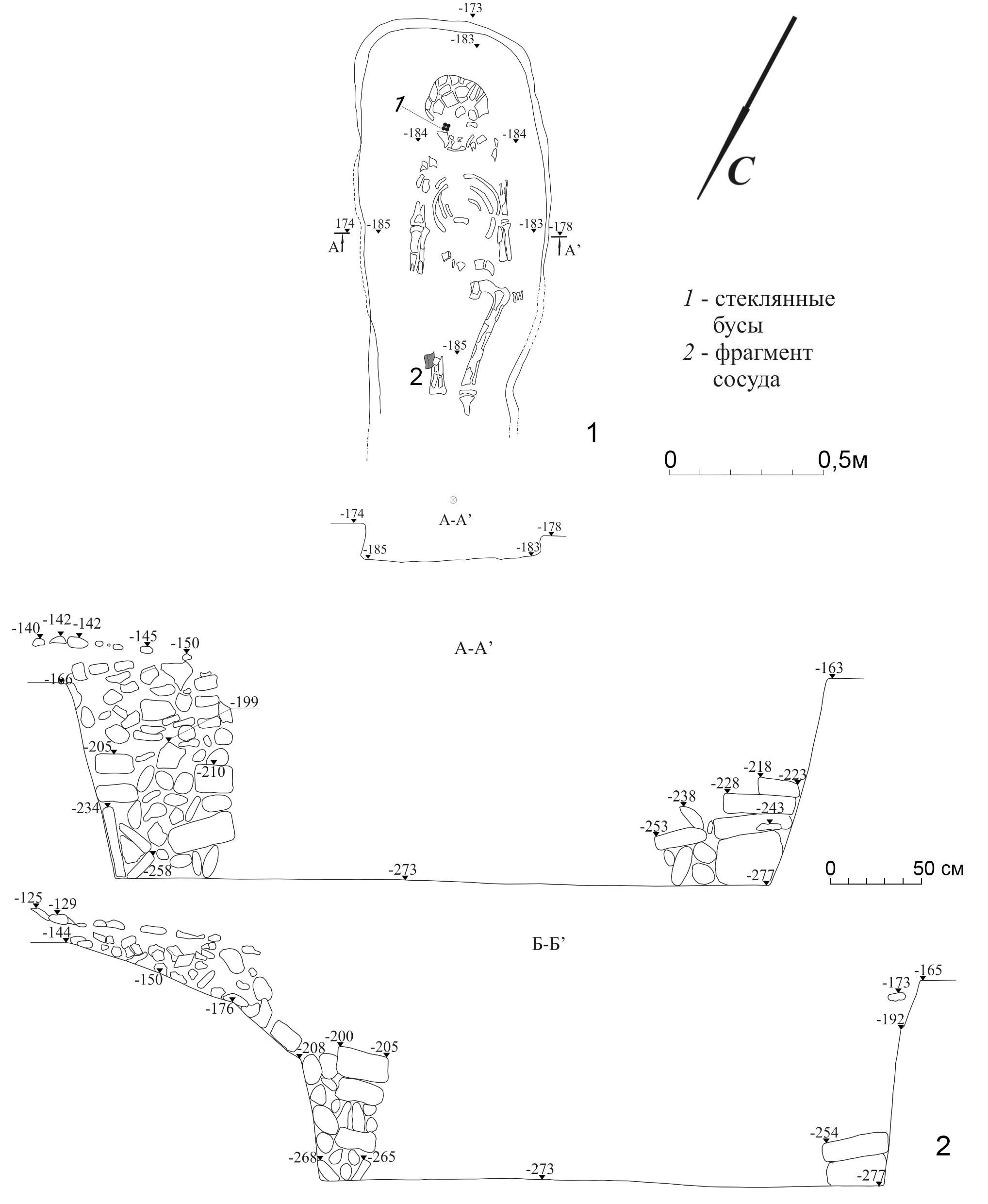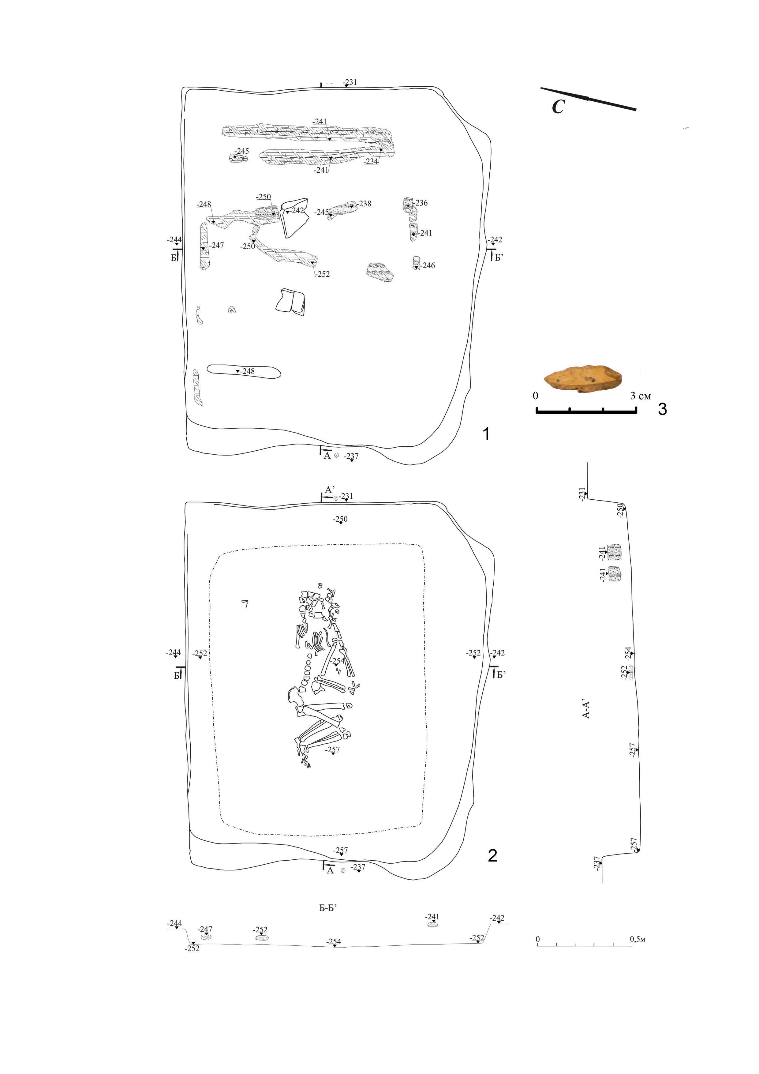 The skeleton of a child, aged 7–10 years, was discovered in a flexed position on the left side, with the head oriented to the ENE. The bones of the body had collapsed onto the chest. The left arm is supine away from the body, with the hand lying near the right knee. The right arm is bent at the elbow joint at a right angle, and the hand lies next to the left knee. The angle in the hip joint of the right leg is obtuse, while in the knee joint, it is acute. In the left leg, the angle in the hip joint is straight, and in the knee joint, it is acute. The feet are brought together and moved towards the pelvis. Dark brown organic decay was found at the bottom (Fig. 7, 2).