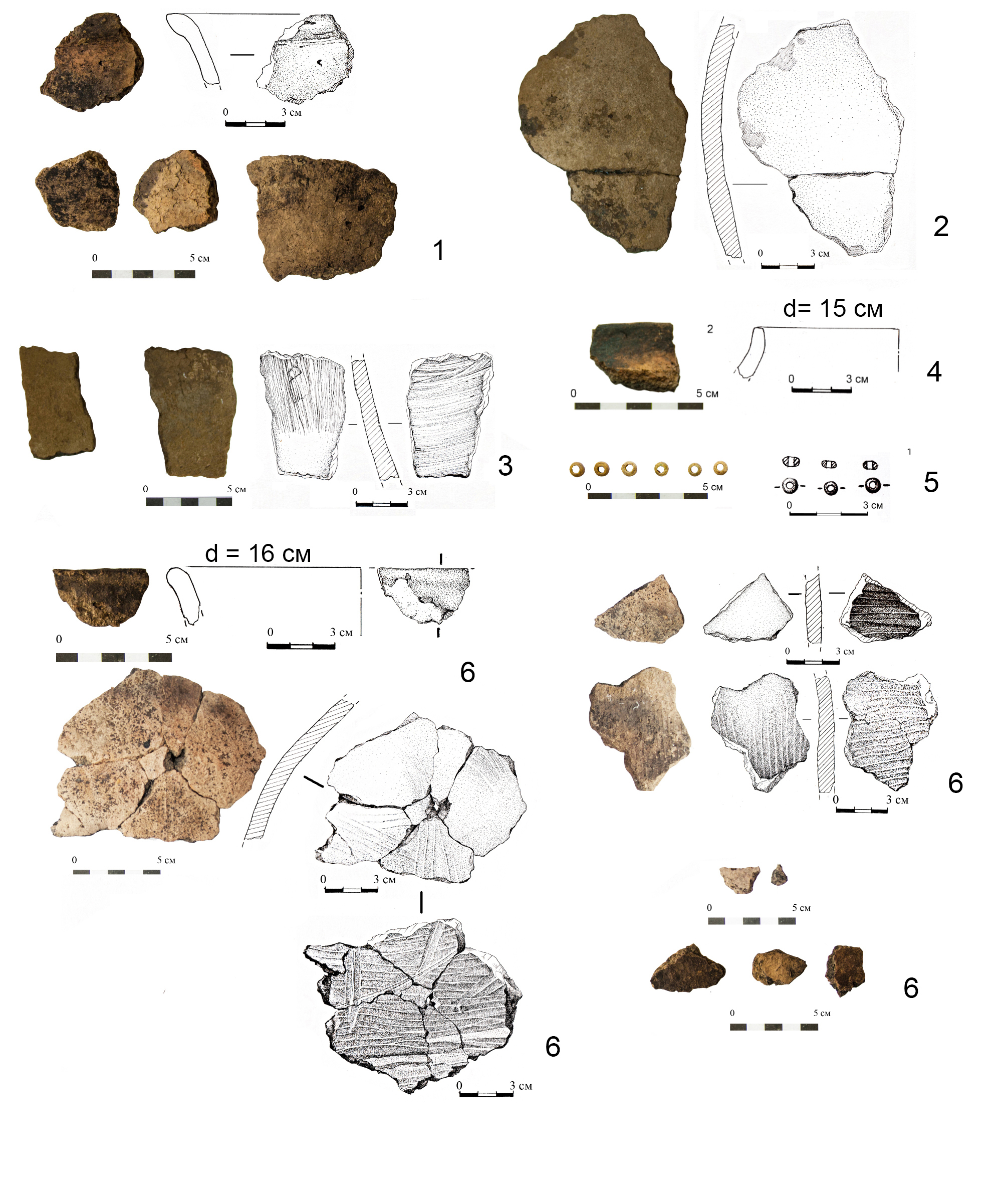 1. Fragments of a hand-made vessel. The vessel is large, with thick walls. The rim is bent outward, the edge is emphasized outside and rounded. On the outer surface of the vessel fragments, which are gray-yellow with gray amorphous spots, traces of smoothing are evident in the form of multidirectional, faintly discernible grooved comb-like stripes. The inner surface is gray-orange with amorphous gray-black spots, displaying clear traces of smoothing, similar to those on the outer surface. In fracture, the shard appears gray. The wall thickness varies between 0.7 and 1.3 cm (Fig. 4, 3).