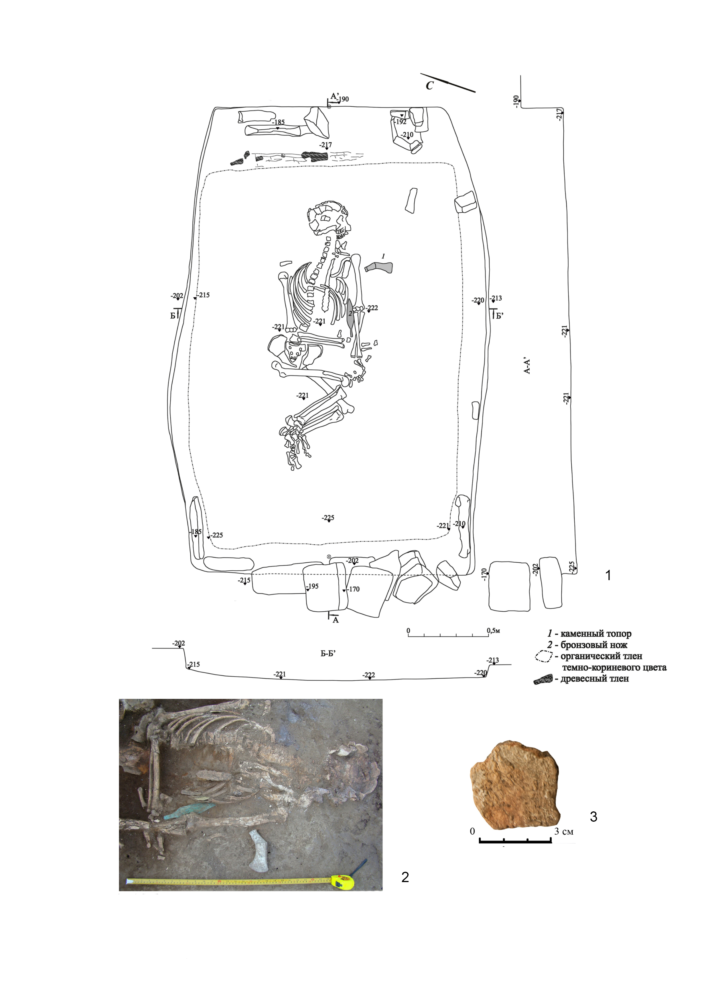 The skeleton of a man aged 55 years or older was uncovered, lying in a flexed position on the left side, with the head oriented to the ENE. The bones of the body had collapsed onto the back. The right arm overlapped the left and was bent at the elbow joint at a right angle, with the hand positioned opposite the abdomen. The left arm was supine along the body, with the hand located near the right knee. The angle in the hip joint of the right leg is straight, while in the left leg, it is obtuse. In the knee joints, the angle is acute. The feet are slightly pulled towards the pelvis (Fig. 5, 1). Beneath the interred man, a layer of organic decay, characterized by a dark brown color and likely of plant origin (bark, reeds?), was discovered.