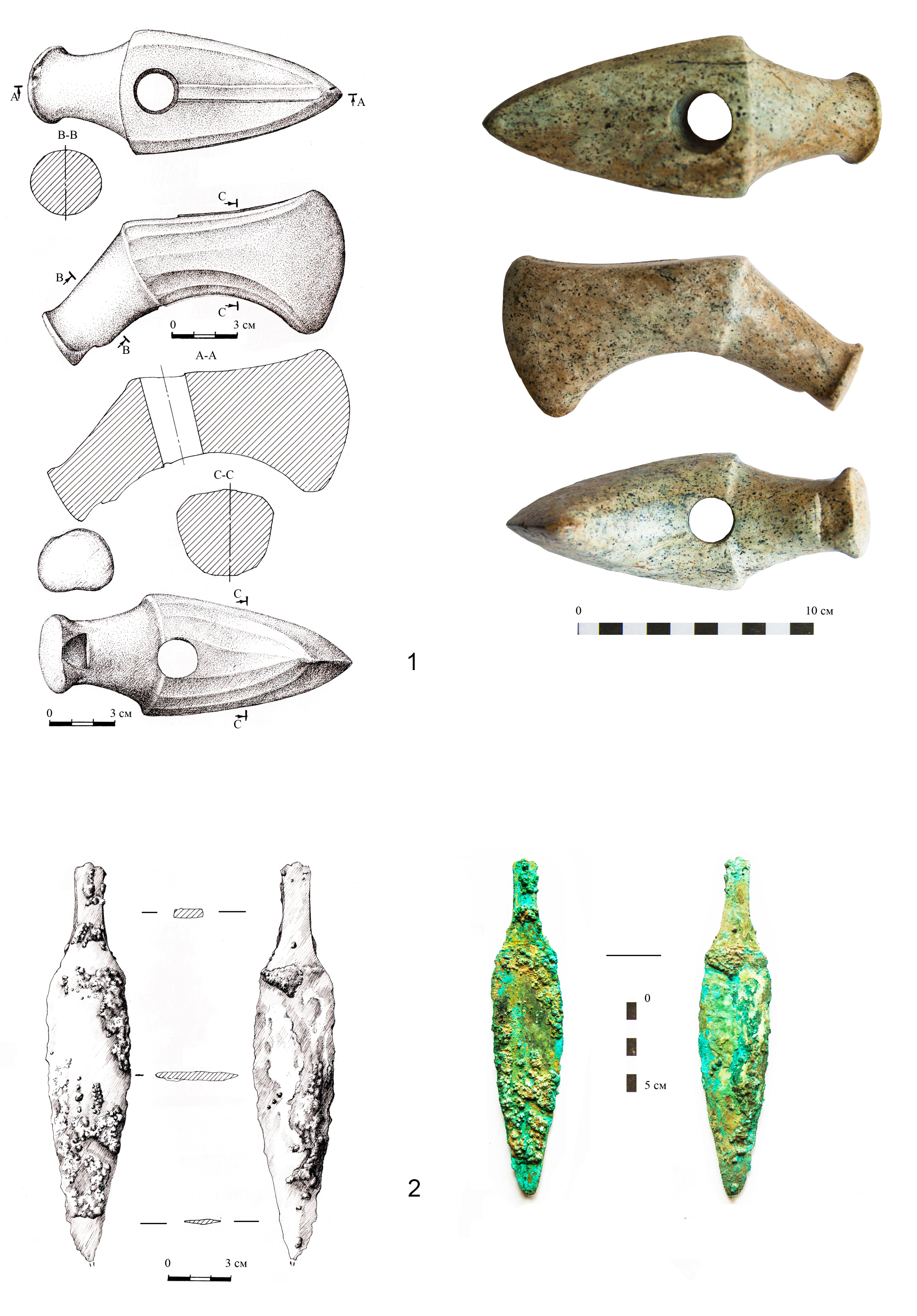 Grave goods. Found near the left shoulder, opposite the chest, was a socketed stone axe with a hammer-shaped butt, with the butt facing the interred. The blade of the axe is curved, the working edge is rounded (Fig. 6, 2). The axe is made from light gray stone with dark speckled inclusions and veining; the surface exhibits thorough polishing. The length of the axe along the longitudinal axis is 14 cm (Fig. 6, 1). The blade is triangular in plan, widening toward the socket, and in side profile, it expands towards the working edge, displaying a multifaceted cross-section with 10 edges. The middle edges on the sides are weakly expressed, particularly at the socket. A longitudinal protrusion (0.7 cm wide and up to 0.2 cm high), simulating a casting seam, is present on the upper edge of the blade. The blade’s length is 9–10 cm, and the working edge measures 6.5 cm in height. The socket hole is round in plan and cone-shaped in section, created through one-sided drilling from the upper plane. The diameter of the upper hole is 2.0 cm, and the lower one is 1.7 cm. The transition from the socket to butt is distinctly marked by a vertical ledge up to 0.3 cm high. The butt is truncated-conical, tapering to a terminal at the end, and oval in cross-section. Dimensions at the socket are 4.5×3.5 cm, and at the terminal – 2.7×2.5 cm. The terminal is disc-shaped, with a diameter of 3.0 cm and a thickness of 0.3 cm. The transition from the body of the butt to the terminal is smooth. The length of the butt with the terminal ranges from 4.5 cm on the lower side to 5.5 cm on the upper side. On the underside of the butt and its terminal, there is a longitudinal split, polished in ancient times, resulting from use.