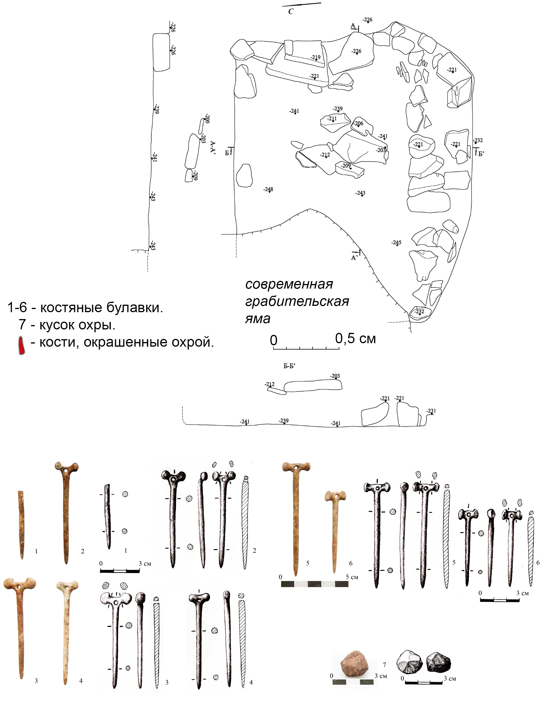 Grave goods. The majority of the grave goods, including bone pins Nos. 1–4, 6, and a piece of ocher No. 7, are concentrated opposite the chest of the interred. One of the pins, No. 5, was positioned on the chest bones. Pins Nos. 3, 4, and 6 were laid with their points towards the head of the interred, while pins Nos. 2 and 5 were placed with their points at the feet. Pin No. 1 was oriented with its point towards the southern wall. All the pins are made from bird bones (Fig. 8, 2).
