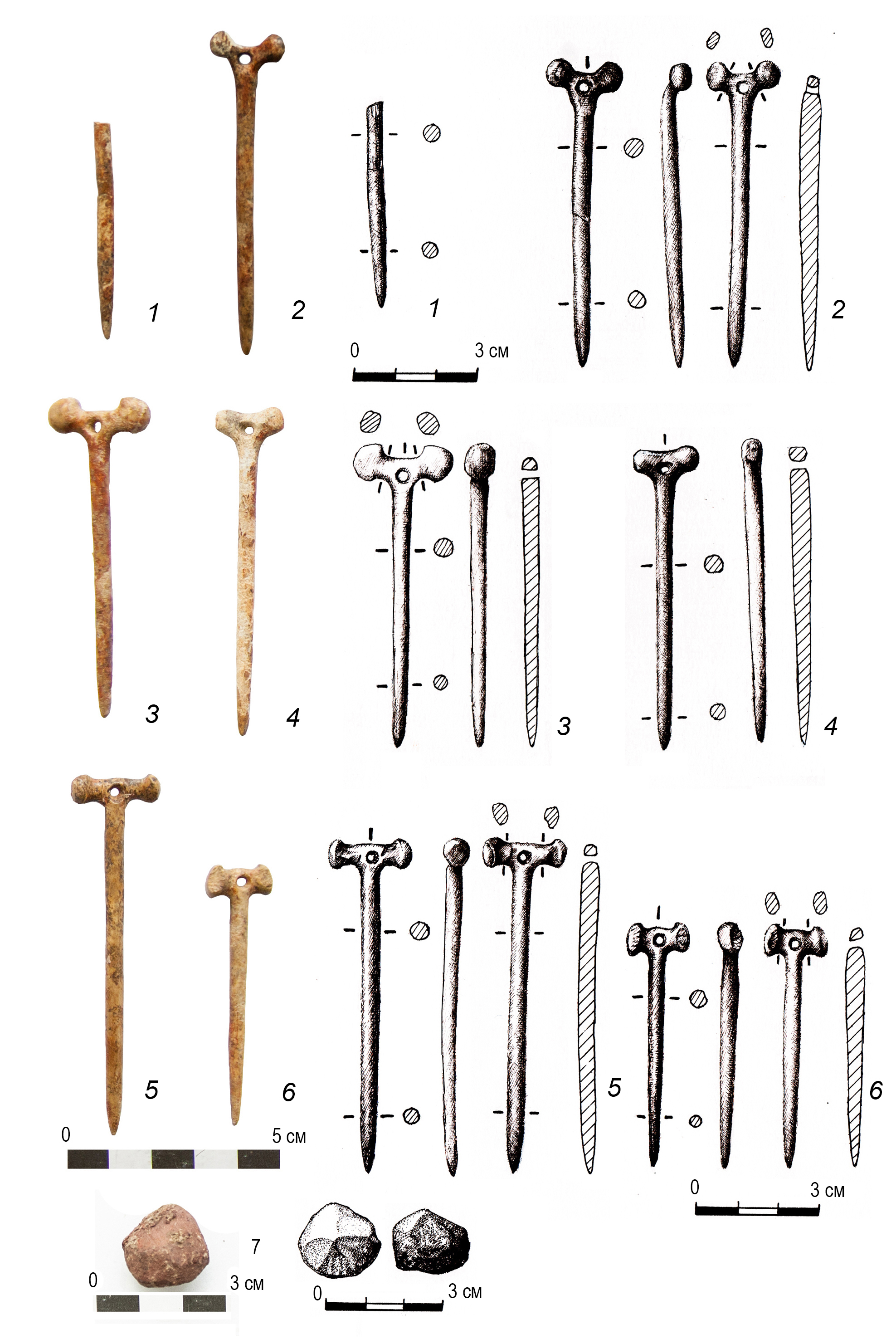 6. Pin No. 6 – hammer-shaped, made from bone. The shaft is cylindrical, with a pointed end. The head is hammer-shaped, consisting of two rounded finials (0.5×0.6 cm), symmetrically positioned on the extension of the shaft with a hole in the middle. Pin dimensions: length – 5.9 cm, shaft length – 5.1 cm, maximum shaft diameter – 0.5 cm, head height – 0.7–0.8 cm, head width – 1.5 cm, and hole diameter – 0.2–0.3 cm (Fig. 9, 6). Additionally, a piece of mineral paint (possibly, ocher), irregular in shape with clearly visible worn edges, measuring 2.0×1.6×1.7 cm, was found (Fig. 9, 7).