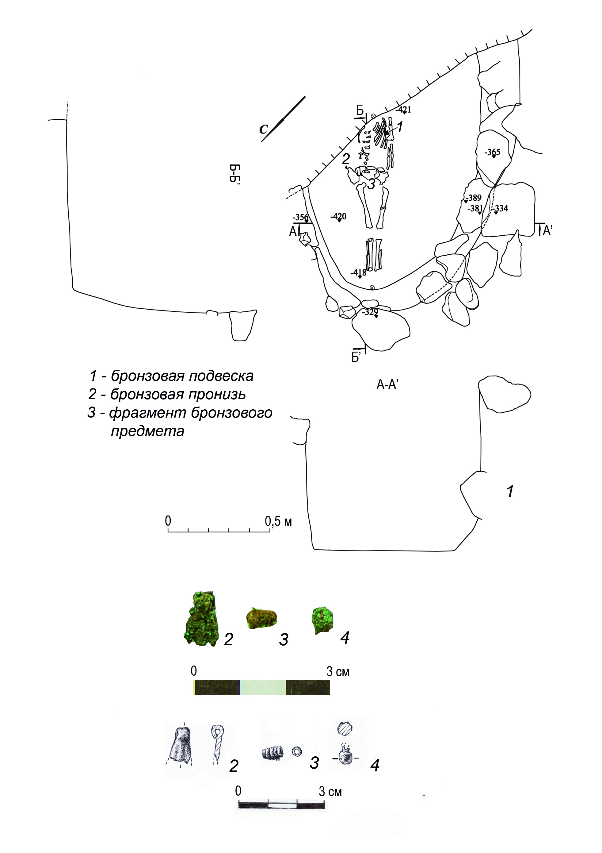 The skeleton of the interred woman suffered damage due to the excavation of the looter’s pit, with only bones of the upper torso and arms being recovered. Based on their position, it is evident that the woman, of approximately 18 years old, was lying in a flexed position on her left side with her head to the east. The left arm was supine and set back from the body, while the right arm was bent at the elbow joint at a right angle. It was impossible to determine the location of the legs. Notably, the left humerus and ribs are painted with ocher (Fig. 8, 2).