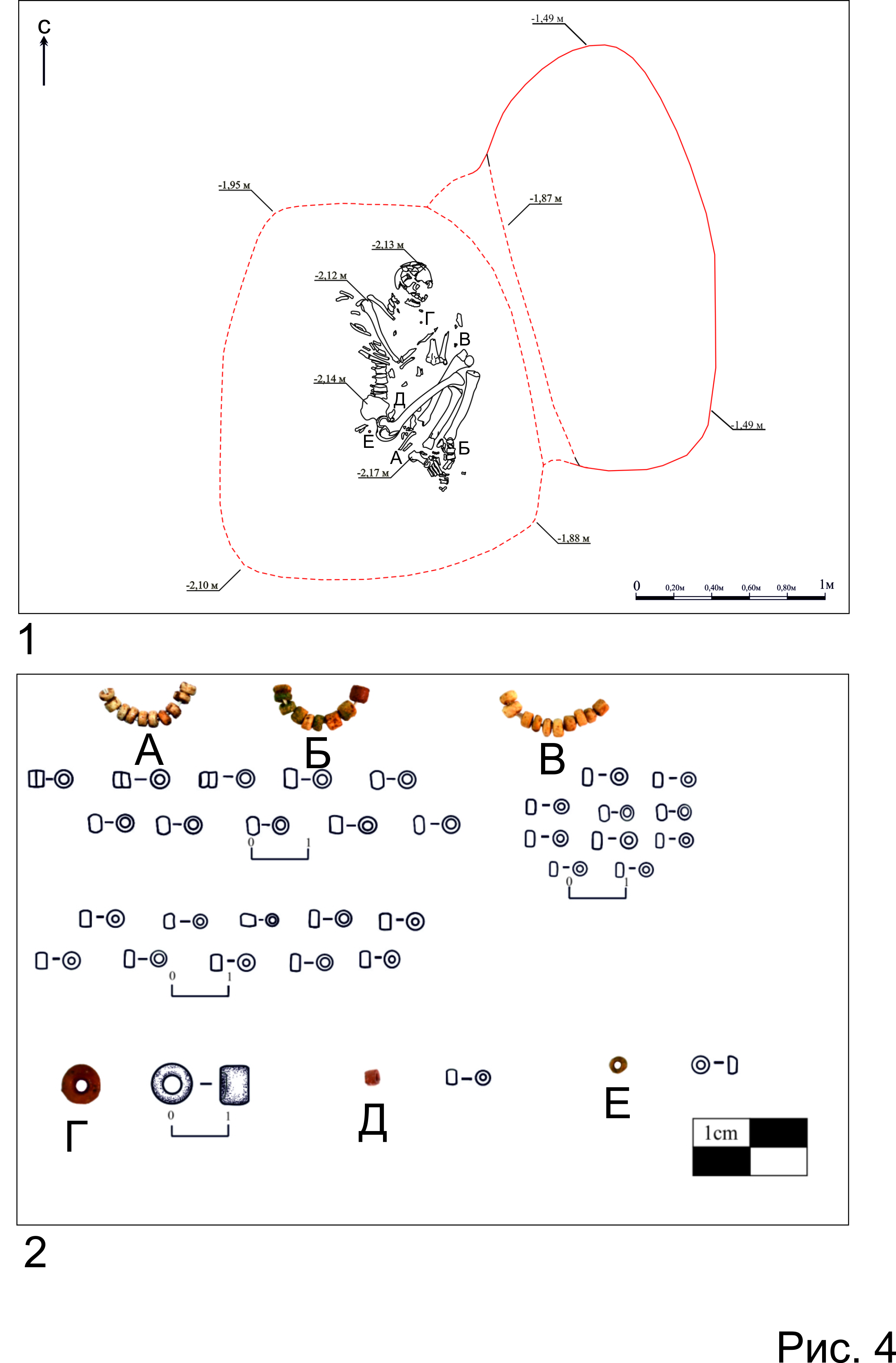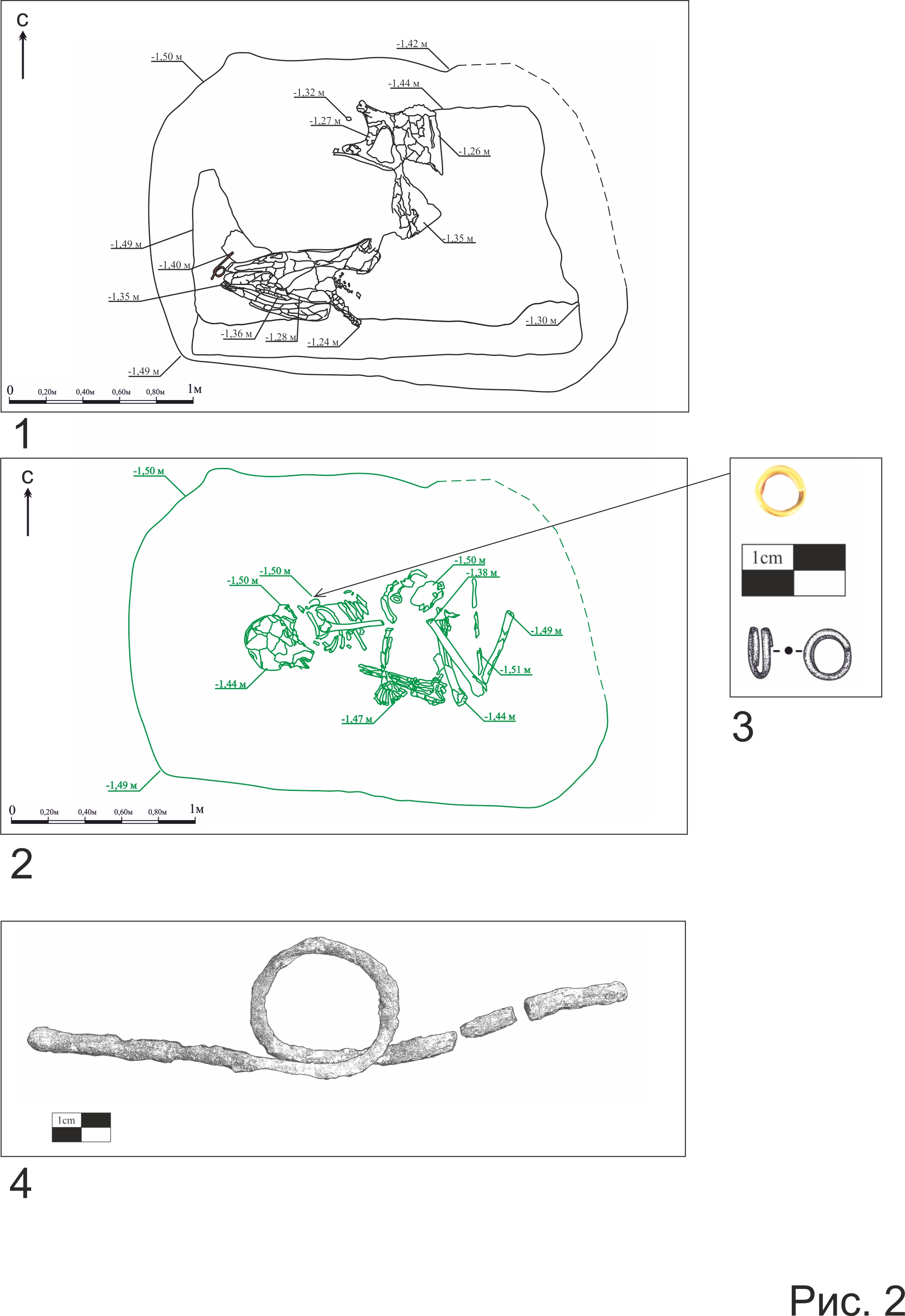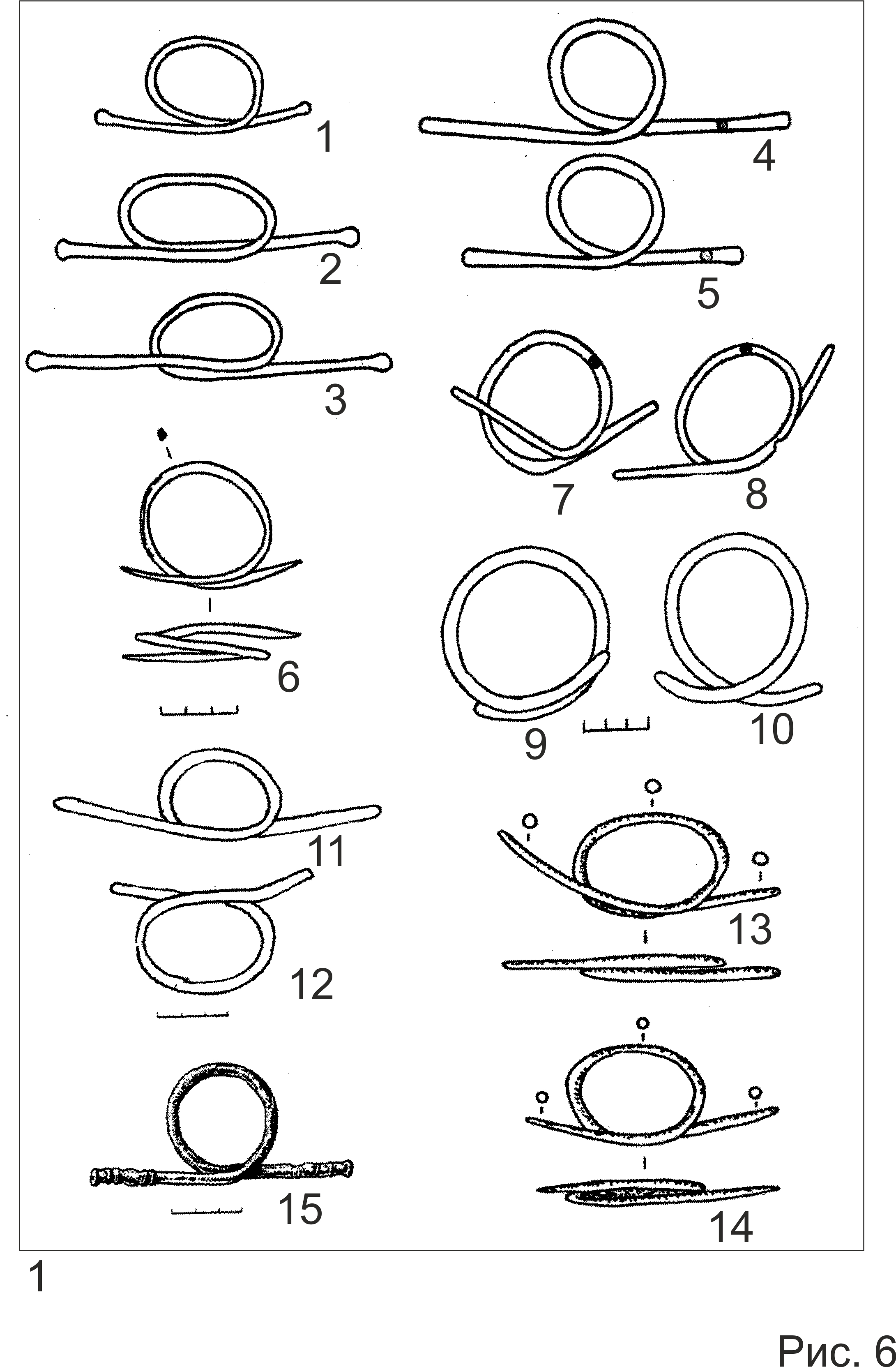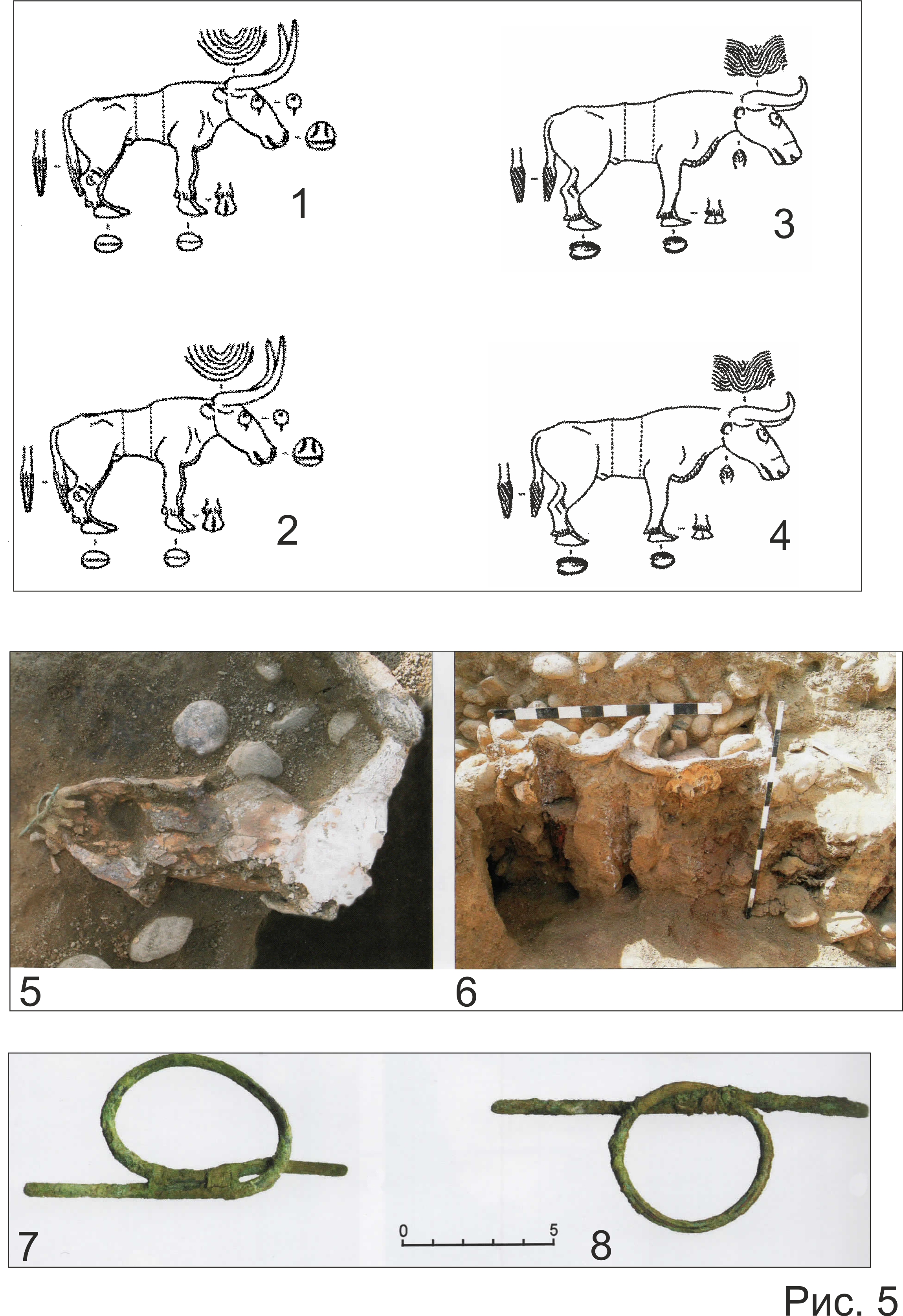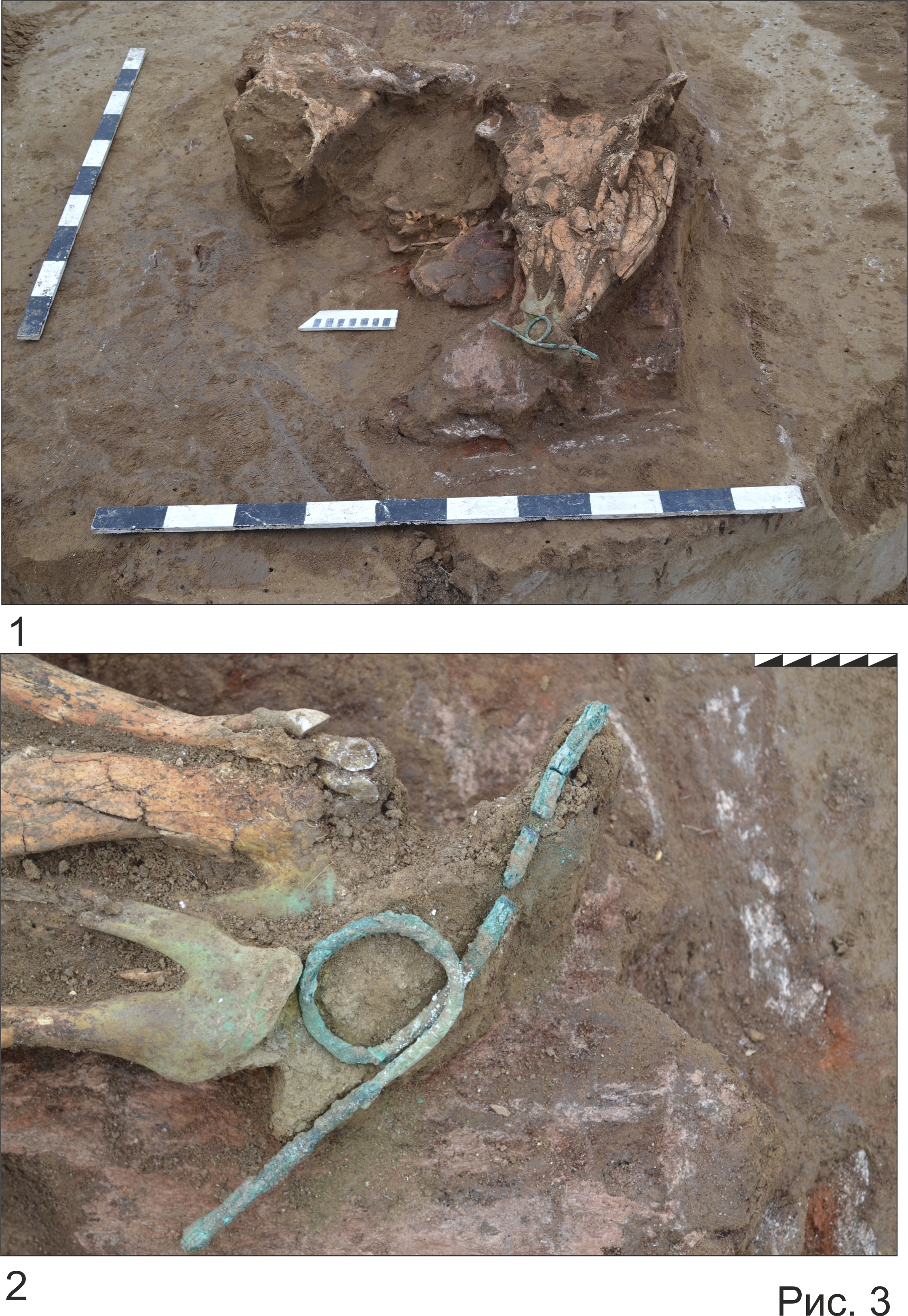 In 2017, in a single burial mound in the Novosrednenskoye-1 burial ground, located near the village of the same name in the Kirovsky district of the Stavropol Territory, a burial was examined on an ancient horizon, over which an earthen embankment was erected. The deceased was in a wooden box, on the ceiling of which were the skulls of two bulls with bronze nose rings. A small series of burial complexes found in burials on the territory of the North Caucasus, in which nose rings were found, are considered. They were used to control animals harnessed to a cart. A symbolic team of two bulls was used to travel the soul of the deceased into the world of their ancestors. In the Novosvobodnenskoe time, a fashion emerged for the use of wire oval pendants, which were fixed not in the puncture of the nasal septum, but in the punctures of the earlobes. Such pendants, made of bronze or silver wire, were popular in the Novotitarovskaya culture, which replaced the Novosvobodnaya culture.