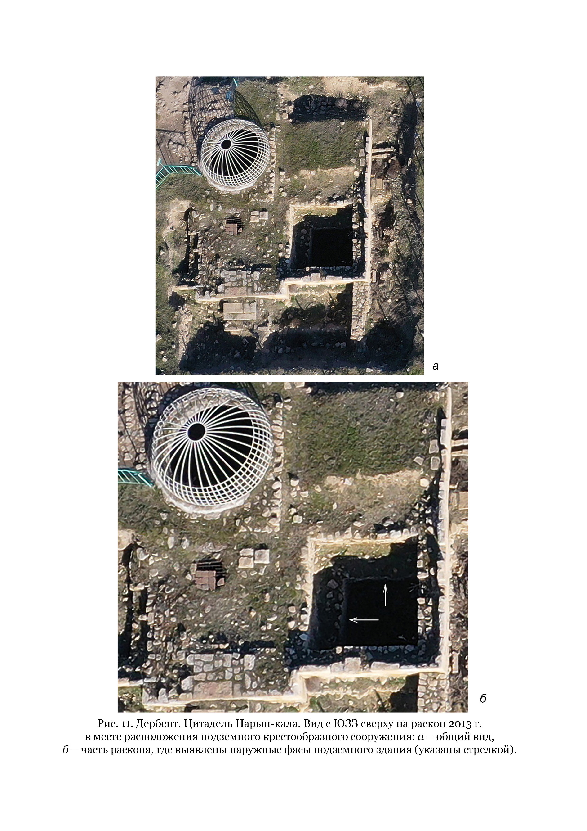 В 2013 г., в преддверии празднования 2000-летия Дербента, под эгидой администрации г. Дербента и под руководством А.А. Кудрявцева были проведены работы на раскопе, заложенном вплотную к западному и южному крыльям данного подземного сооружения. Раскопки ставили целью доказать, что это здание является древним христианским храмом. Информация об этих работах получила довольно широкую огласку в СМИ, однако ни одной научной публикации по ним до сих пор, по прошествии уже восьми лет, не было. Но посетители цитадели Нарын-кала могут воочию увидеть этот раскоп и вскрытые строительные остатки (рис. 10, 11), которые медленно и неотвратимо разрушаются под открытым небом.