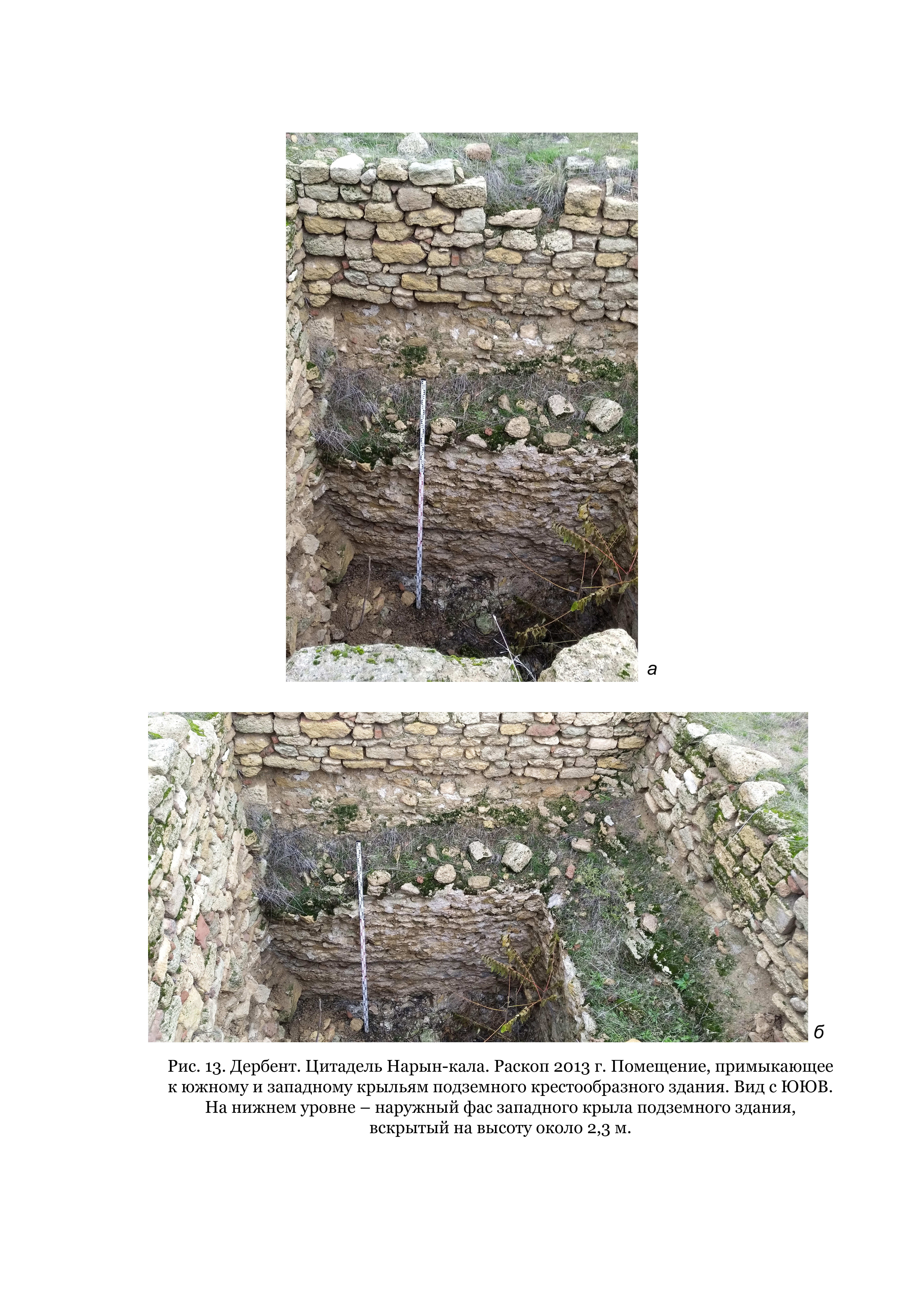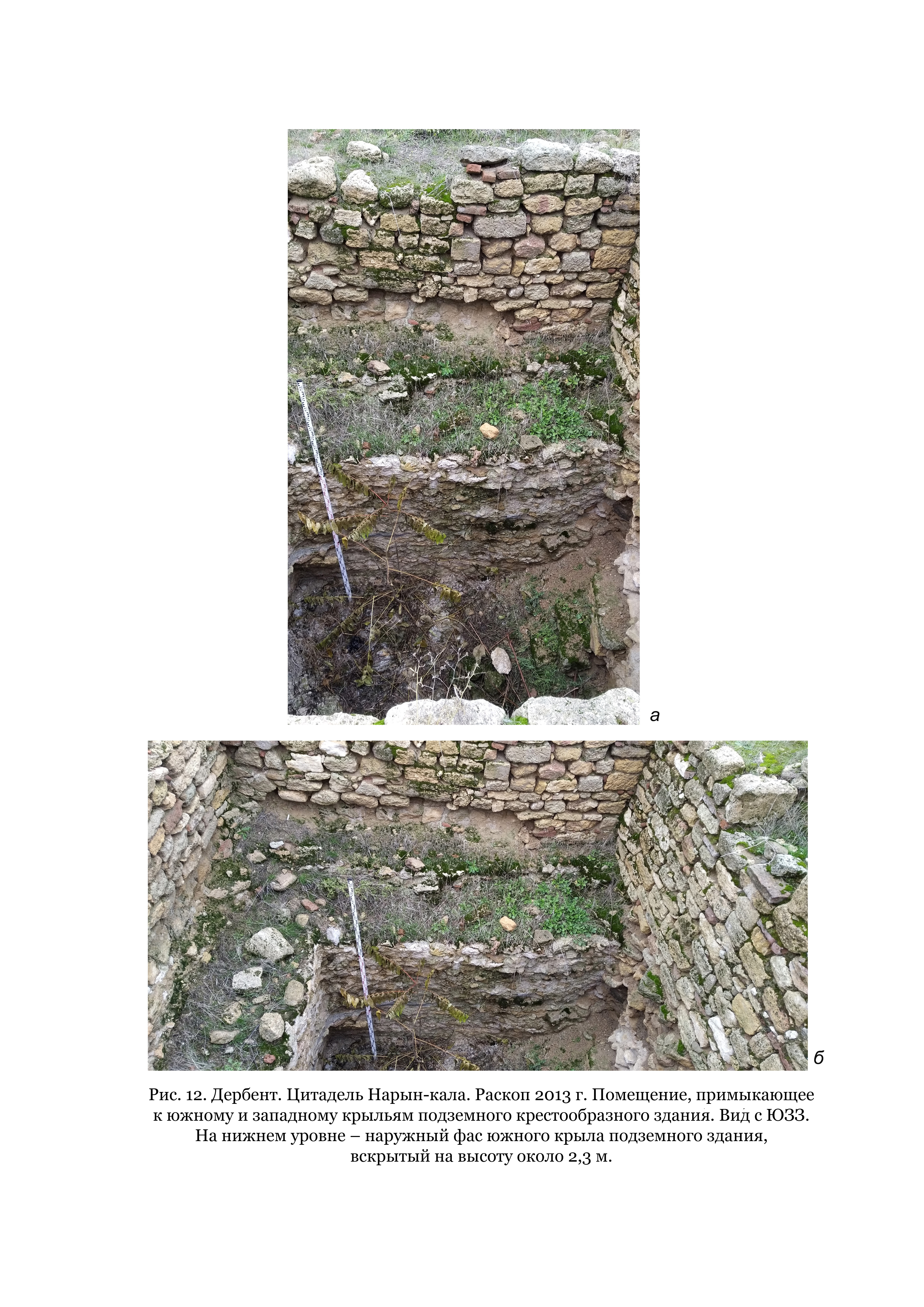 | 11. | Fig. 12. Derbent. Citadel of Naryn-Kala. Excavation site of 2013. A room adjacent to the southern and western wings of the underground cruciform building. View from the SWW. On the lower level – the outer facade of the southern wing of the underground building, uncovered to a height of approx. 2.3 m | View (8MB) | Indexing metadata |