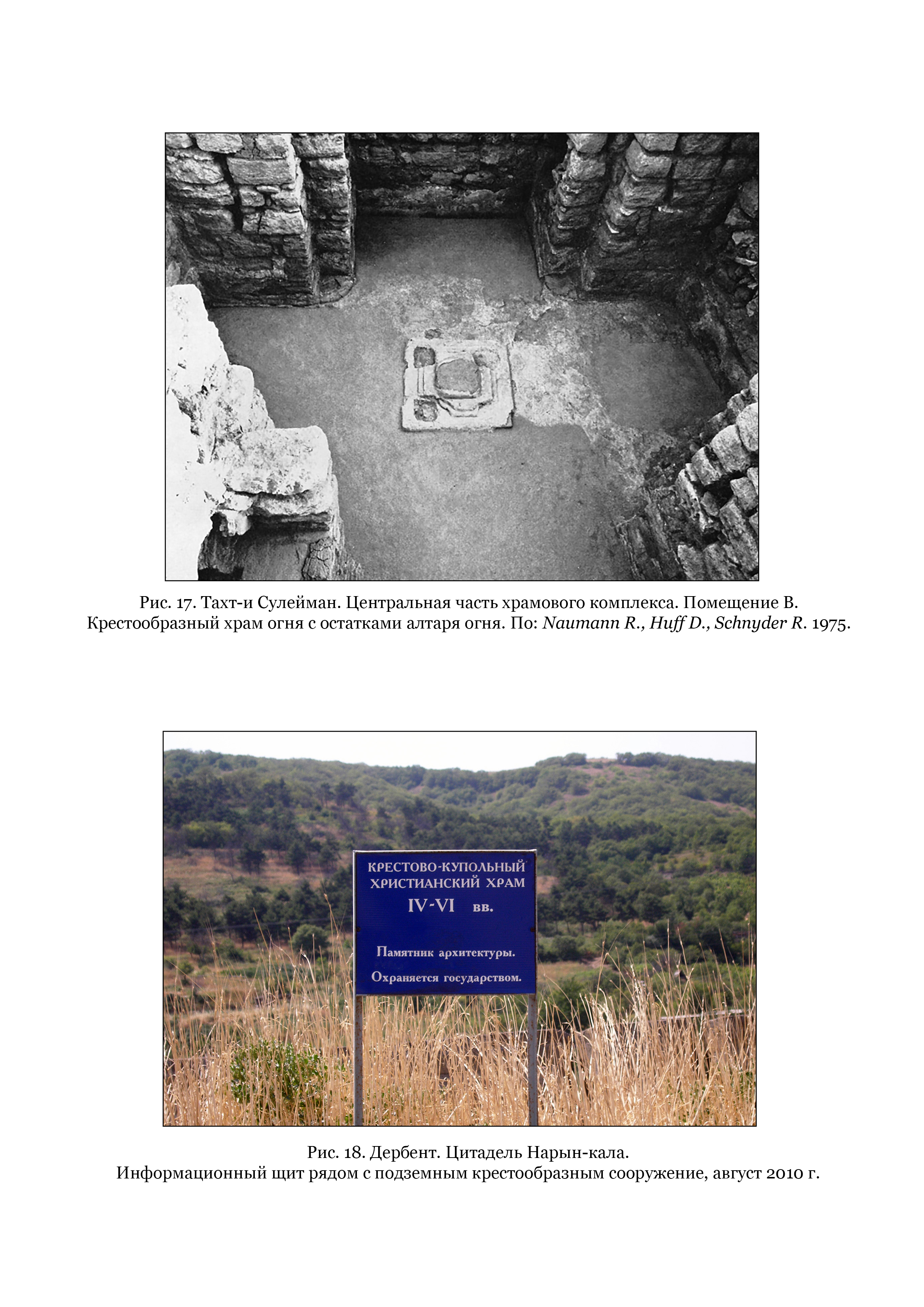 | 15. | Fig. 17. Takht-i Suleiman. The central part of the temple complex. Room B. Cruciform temple of fire with the remains of the altar of fire. According to: Naumann R., Huff D., Schnyder R. 1975. Fig. 18. Derbent. Citadel of Naryn-Kala. Information board next to the underground cruciform structure, August 2010 | View (2MB) | Indexing metadata |