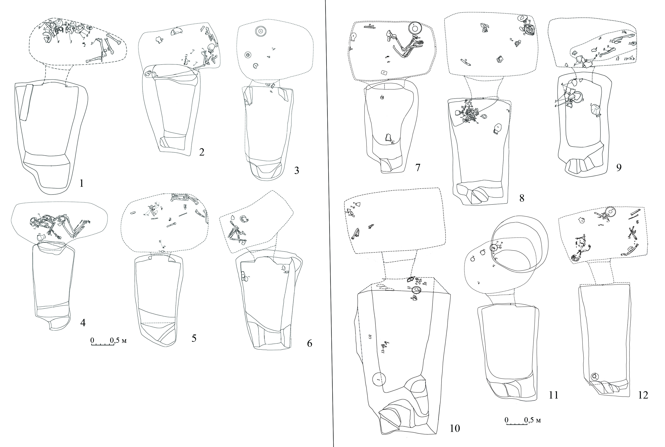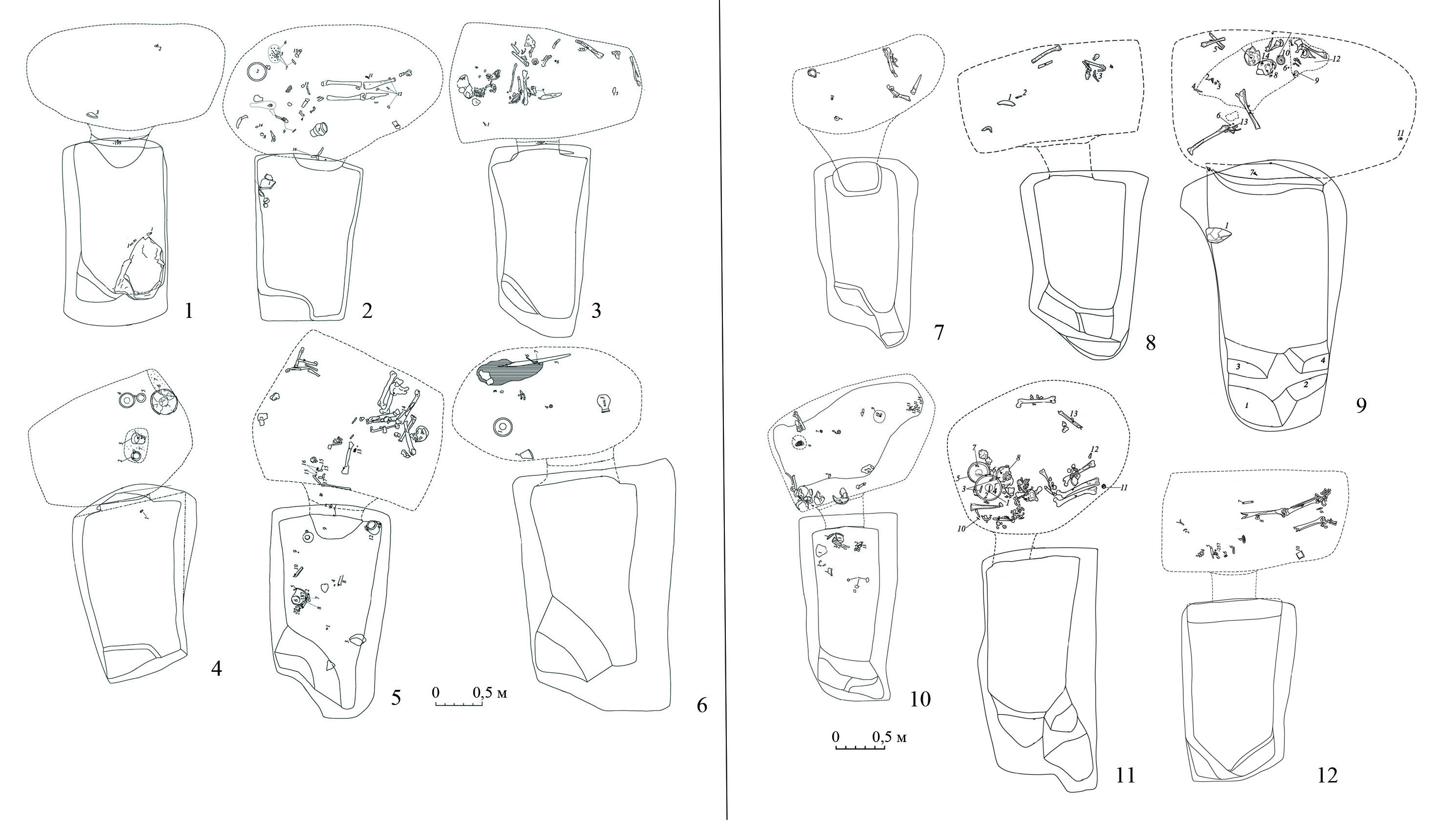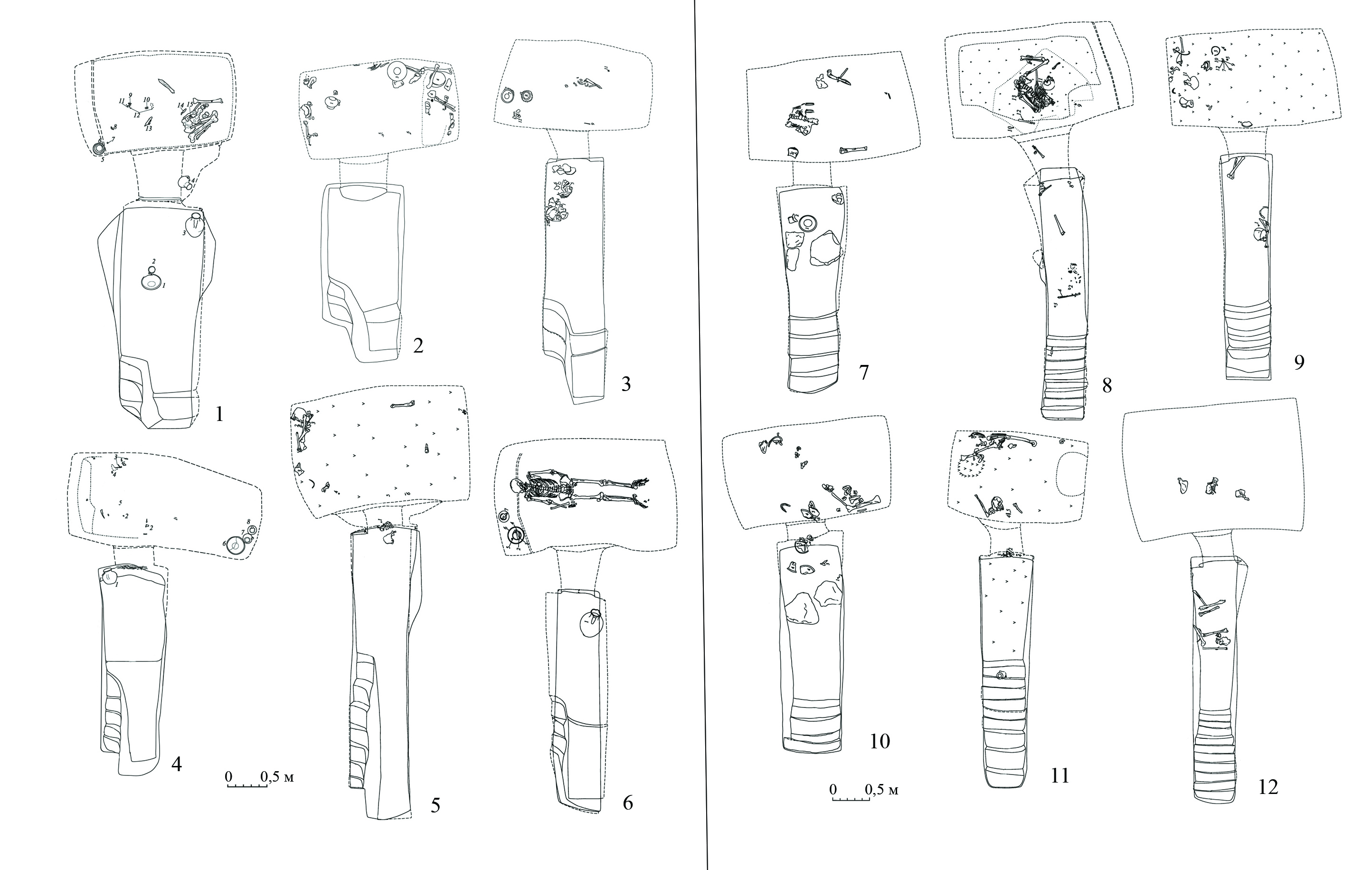 4. Две и более ступенек, расположенных в виде лестницы вдоль задней стенки входной ямы из одного угла к другому (рис. 2, 7-12). С данной разновидностью соотносятся ступеньки, также расположенные вдоль задней стенки входной ямы, но образующие несколько «пролетов», что, очевидно, связано со значительной глубиной входных ям, достигающих 7–8 м; они зафиксированы в могильнике Экажевские 1-е курганы [13, рис. 3, 7; 14, рис. 4].