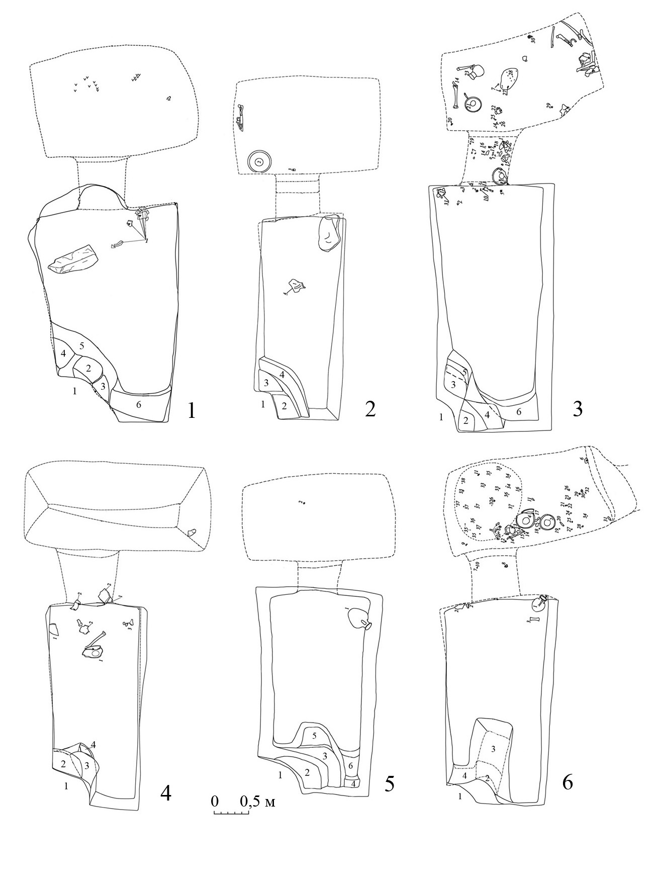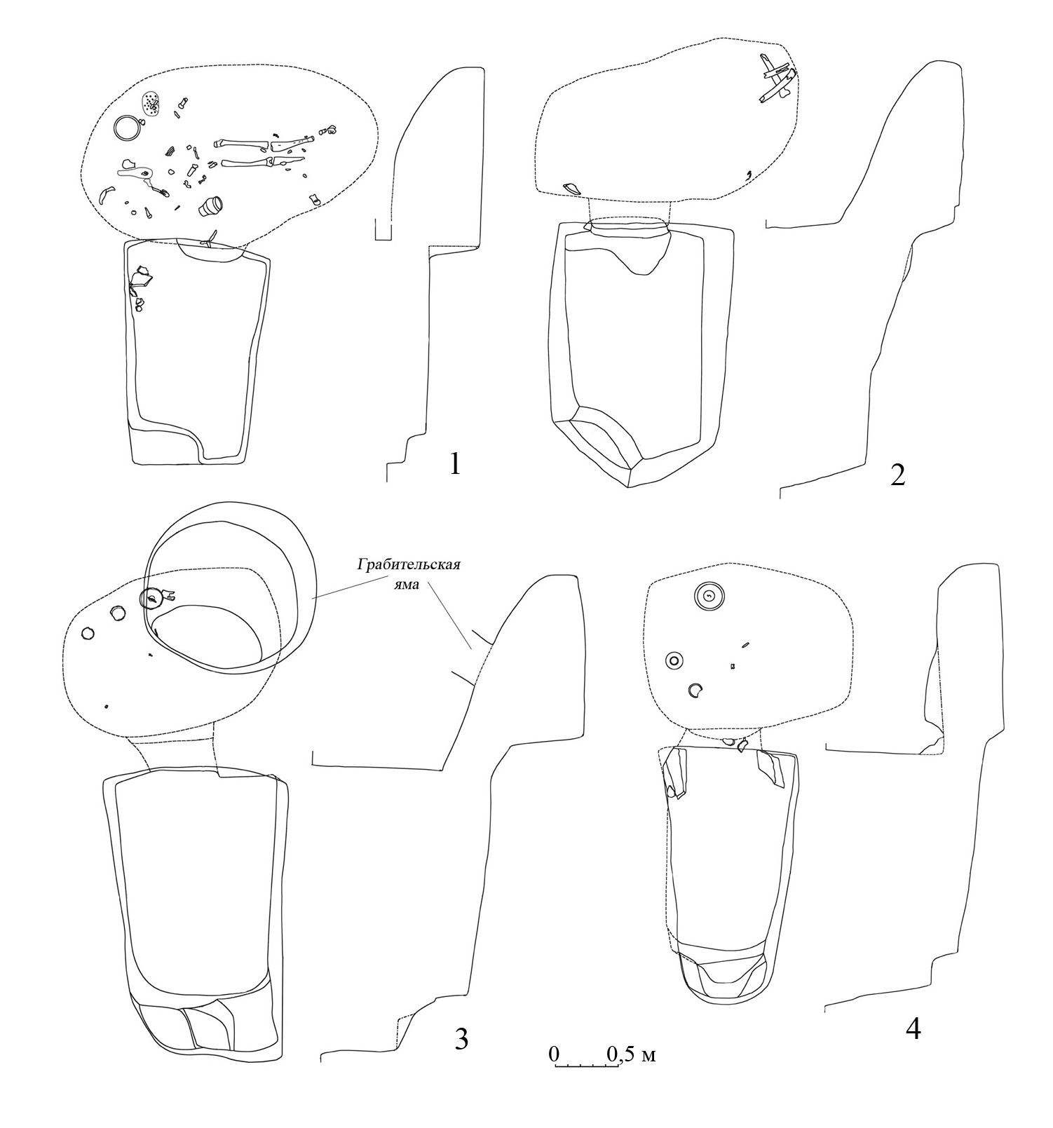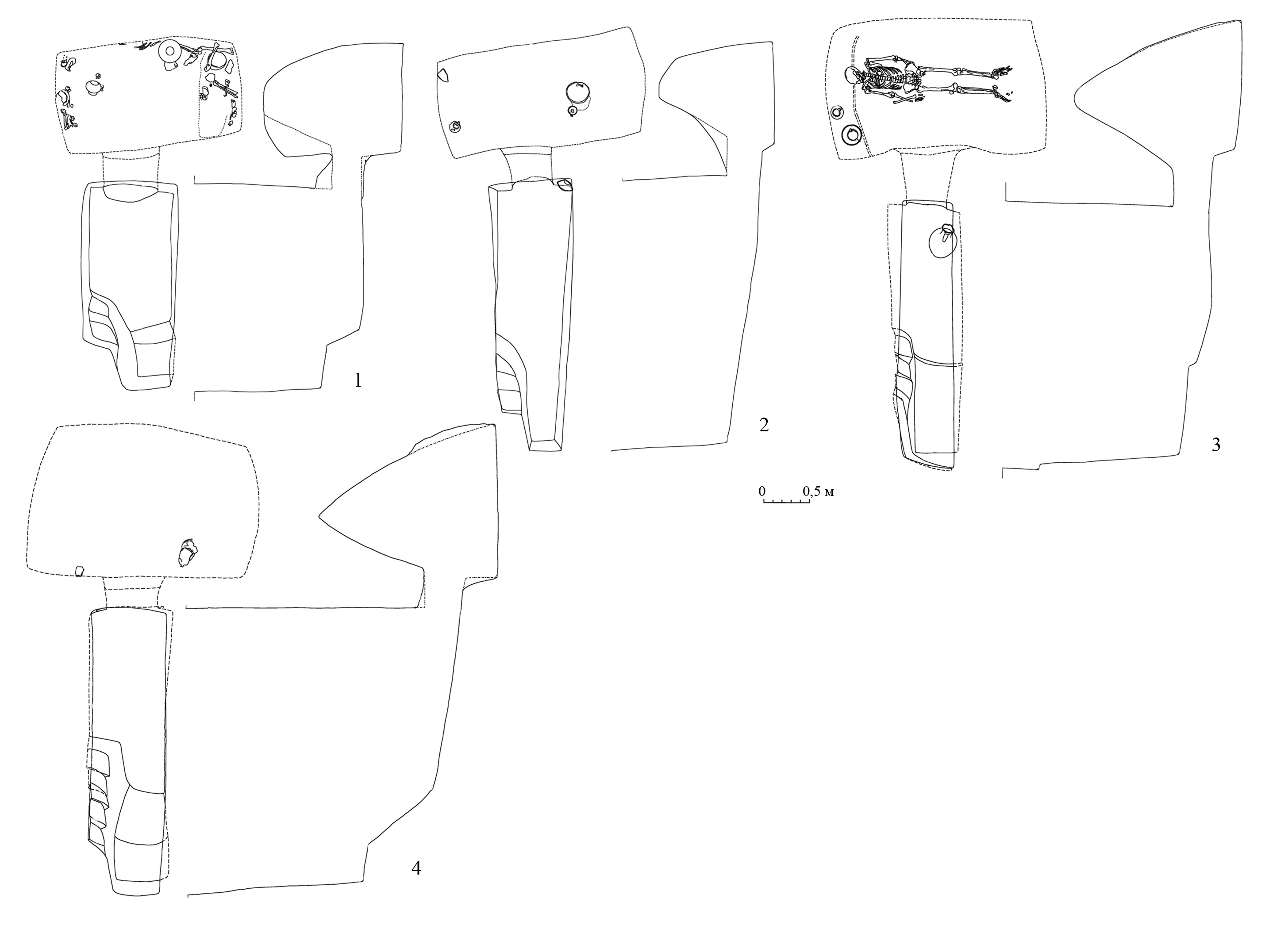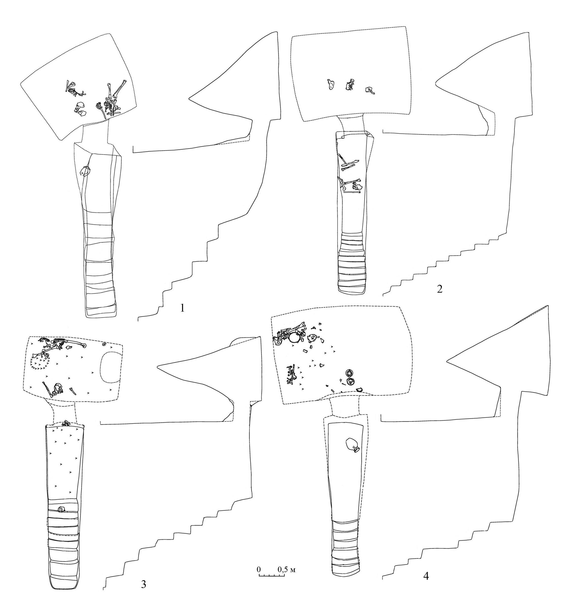 Форма свода. В анализируемой выборке выделены следующие основные (наиболее массовые) разновидности формы свода: понижающийся от входа к передней стенке камеры (рис. 5, 2, 3); горизонтальный от входа с выраженным переходом в переднюю стенку (рис. 5, 4); вынесенный вверх от входа трапециевидной в разрезе формы (рис. 6, 1, 2); вынесенный вверх стрельчатый в разрезе (рис.  6, 3,  4). Помимо этого, как промежуточный вариант первых двух разновидностей отдельно отмечен свод с горизонтальным участком от входа и дальнейшим понижением к передней стенке (рис. 5,  1). ­Присутствуют также редкие разновидности в виде купольного свода (полукруглый переход стенок в конек свода) и  незначительно вынесенного от входа вверх, но не имеющего отчетливой в разрезе формы. Часть случаев, вследствие сохранности и невозможности однозначной реконструкции, была квалифицирована следующим образом: вынесенный от входа вверх (вследствие обрушения форма достоверно не реконструируется) и стрельчатый/трапециевидный (вследствие сохранности форма может реконструироваться и как стрельчатая, и как трапециевидная). Важно отметить, что характер свода – ­вынесенный от входа вверх или понижающийся/горизонтальный – коррелируется с высотой ступеньки в камеру: на  уровне тенденции, чем выше и более выражено вынесен вверх свод камеры, тем ниже ступенька в нее.