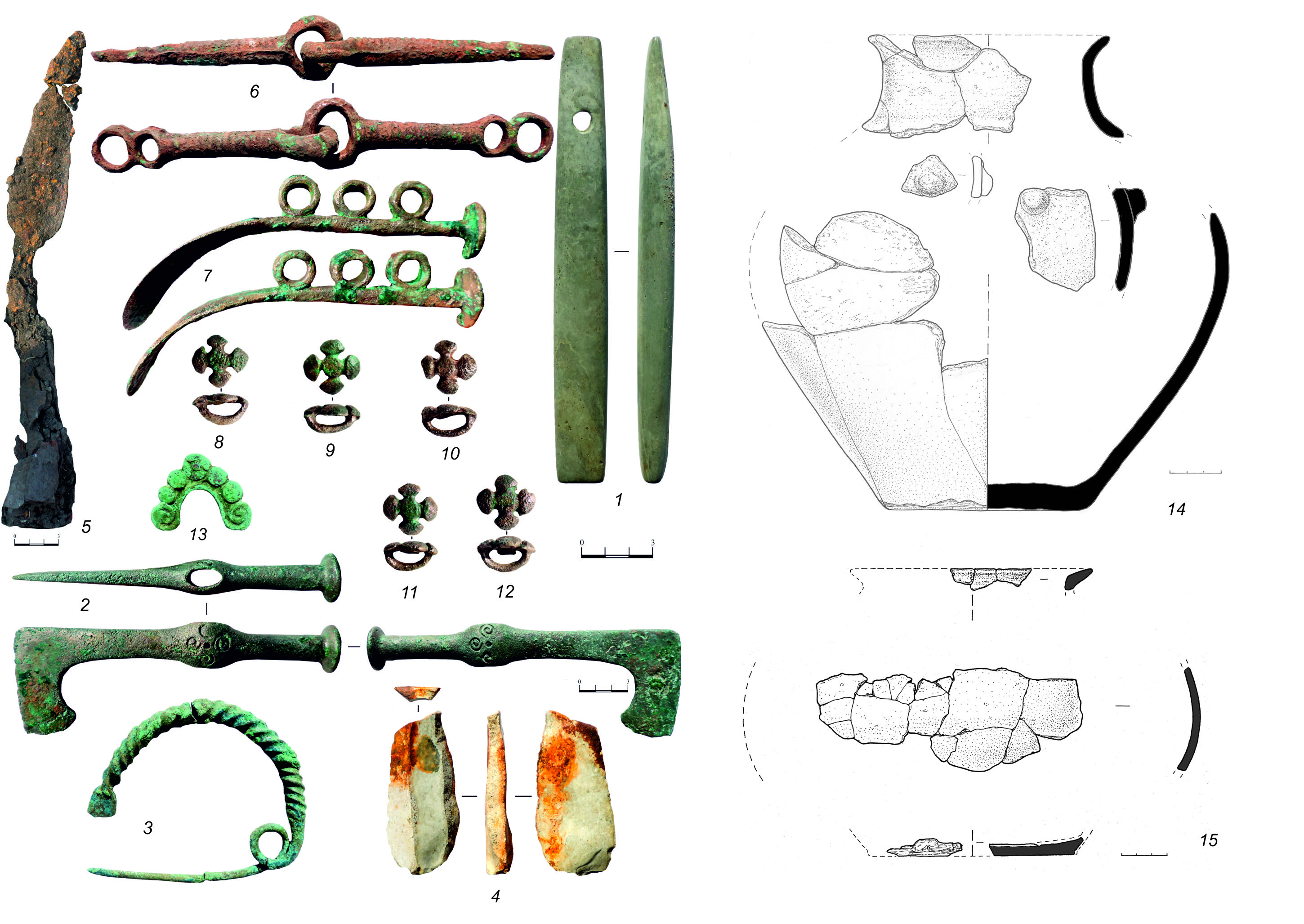 При покойном за головой справа от черепа обнаружены бронзовый топор-скипетр (рис. 1, 2) и оселок (рис. 1, 1). На грудной клетке поверх сочленения левой кисти зафиксирована дуговидная фибула (рис. 1, 3). На уровне грудной клетки справа от скелета найдены железный втульчатый наконечник копья (рис. 1, 5) и кремневый отщеп-пластина (рис. 1, 4). В ногах погребенного располагался уздечный набор, состоящий из 5 бронзовых четырехлепестковых бляшек-розеток (рис. 1, 8–12), бронзовой лунницы (рис. 1, 13), бронзовых удил (рис. 1, 6) и парных псалиев (рис. 1, 7). При разборе перекрытия могилы в юго-восточной ее части обнаружены развалы двух сосудов (корчаг), стоявших в ногах покойного, один из которых удалось реконструировать (рис. 1, 14–15).