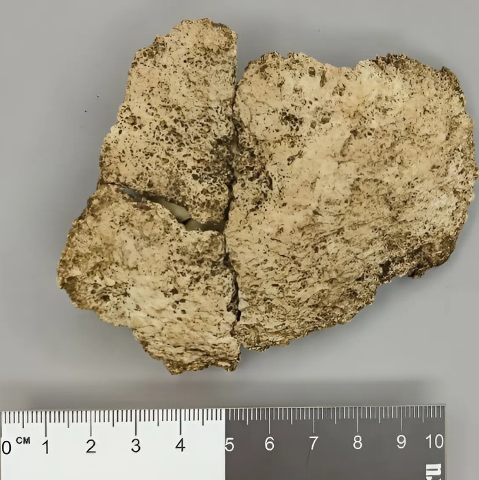 Костная ткань скелета очень плохой сохранности, соответствующей 5 баллам, при которых процесс деструкции привел к полному разрушению компактного вещества, кости очень хрупкие и представлены множеством фрагментов [12]. Череп представлен фрагментами покровных костей, а посткраниальный скелет – диафизами длинных костей. Судя по степени стертости зубных коронок, индивид умер в возрасте старше 55 лет [13]. Общая массивность скелета, развитие макро- и микрорельефа на костях и выраженность рельефа, размер сосцевидных отростков и затылочного бугра позволили предположить мужской пол погребенного. На левой теменной кости покойного имеется след от травмы, зажившей задолго до смерти. Размер дефекта 2,3×2,5 см. Травма округлой формы находится почти в центре кости, чуть смещена назад. Область дефекта хорошо заживлена и не несет следов воспалительных процессов ни в области ранения, ни на других сохранившихся частях черепа. К сожалению, степень деструкции костной ткани, а также прошедшие процессы заживления не дают возможности восстановить оружие, которым было нанесено ранение. Вероятнее всего, совершена она была тупым предметом с преобладающей поверхностью. Отсутствие выраженного воспалительного процесса дает возможность с осторожностью предположить лечение травмы в процессе ее заживления (рис. 2).
