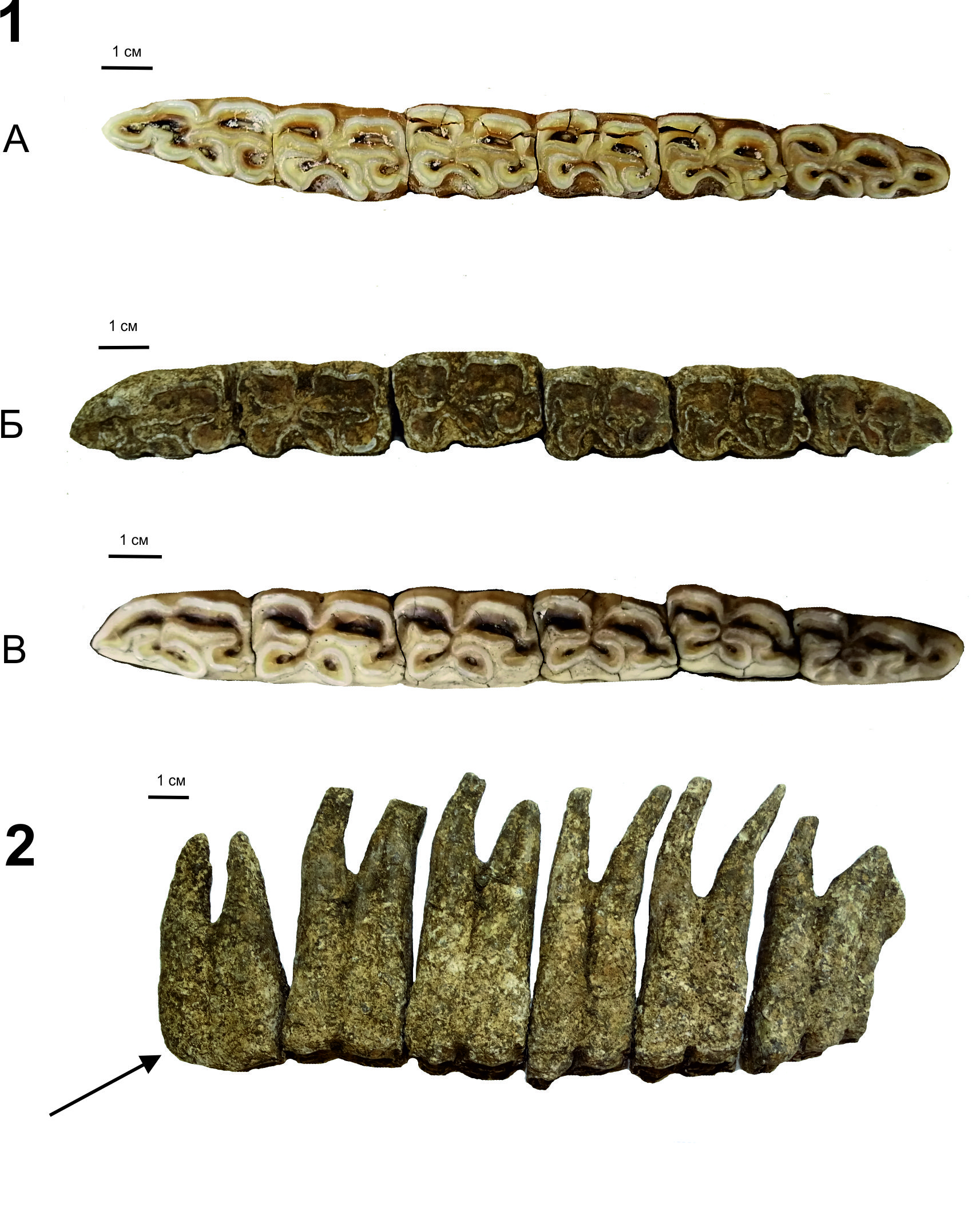 По визуальному исследованию остатков, их комплектности и пропорциям установлено, что в погребении №1 кургана было захоронено вместе с человеком одно животное. Следов разделки туши не выявлено. Наличие клыков указывает, что это жеребец. На верхних и нижних премолярах (Р2 и р2) есть стёртость в передней части зуба (рабочая патология), свидетельствующая об использовании животного в качестве ездового (рис. 3, 2). Индивидуальный возраст, определенный по посткраниальному скелету и стертости резцов, указывает на взрослое, половозрелое животное (около 10–11 лет), однако пропорции сохранившихся костей конечностей характеризуют животное как крайне грацильное и малорослое: по длине лучевой, большой берцовой, пястной и плюсневой костям – малорослая (136–128 см в холке) (по О.В. Витту [21]); по длине плюсневой и пястной костей – 133–134 см в холке (по Л. Кизевальтеру [22]); по пястной и плюсневой кости – тонконогая (по И.Д. Черскому [23], по А.А. Браунеру [24]); по 1-й передней фаланге – узковерхняя (по А.А. Браунеру [24]). В связи с этим возникло предположение, что это может быть осёл или гибрид с ним. Однако в рисунке эмали щечных зубов не прослеживаются четкие «ослиные», скорее имеют место промежуточные признаки (рис. 3, 1). Для решения этого вопроса было проведено морфометрическое исследование.