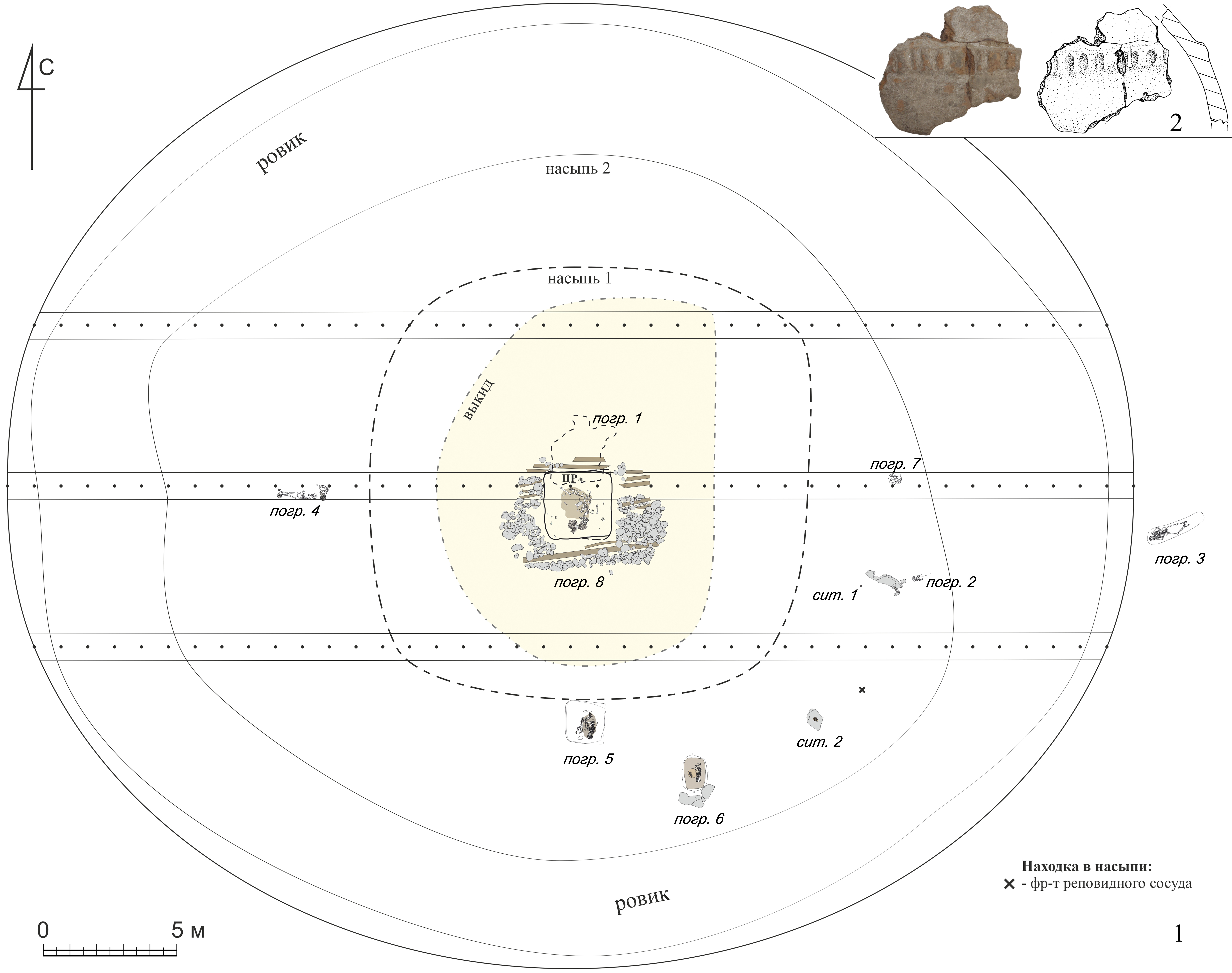 По полученным стратиграфическим данным установлено, что курганная насыпь возводилась в два приема (рис. 1, 1). Первоначальная насыпь (1) была создана над основным погребением №8. Впоследствии в непосредственной близости от насыпи 1, с уровня древней дневной поверхности были сооружены погребения №№5, 6 и оформлен комплекс, получивший наименование ситуация №2. Именно с этим этапом связано возведение насыпи 2, которая уже в последние века до н.э. использовалась кочевым населением в качестве, вероятно, родового кладбища.