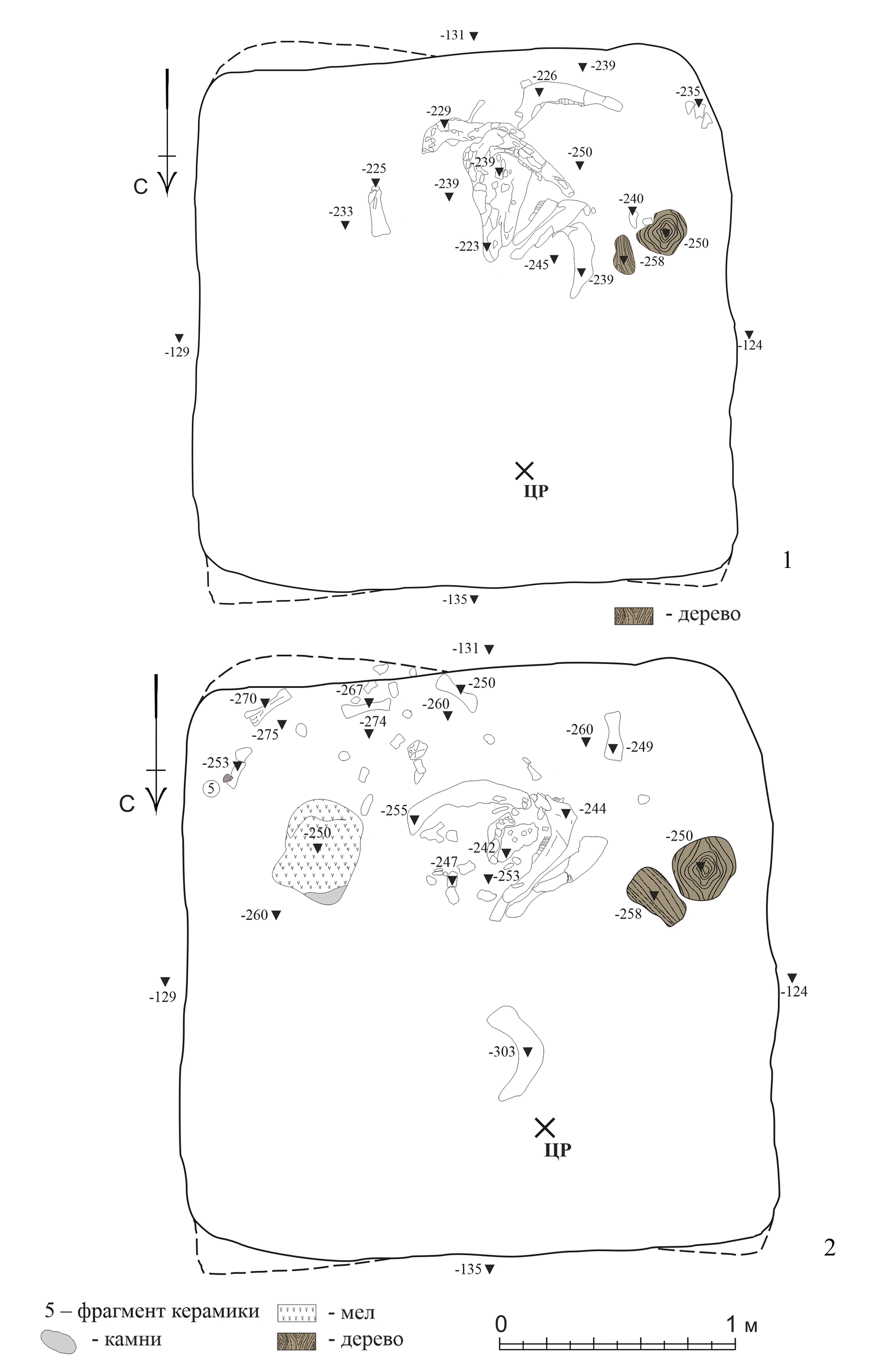 3. В заполнении южной части ямы, ближе к центру на глубине от 2,19 м до 3,03 м, обнаружены плохо сохранившиеся остатки двух черепов с нижними челюстями, один под другим, а также разрозненные кости конечностей крупного рогатого скота (далее КРС – Bos Taurus)2 (рис. 3). Верхний череп лежал основанием вверх, передней частью морды к С (рис. 3, 1). Фрагменты нижней челюсти сдвинуты к Ю и ЮЗ. Левый рог в сочленении с черепом. Правый находился отдельно от черепа и сдвинут к СЗ. Под костями головы КРС зафиксирован древесный тлен, а под деревянным тленом встречены камни перекрытия. Не исключено, что для оформления площадки с черепом использовался деревянный настил.