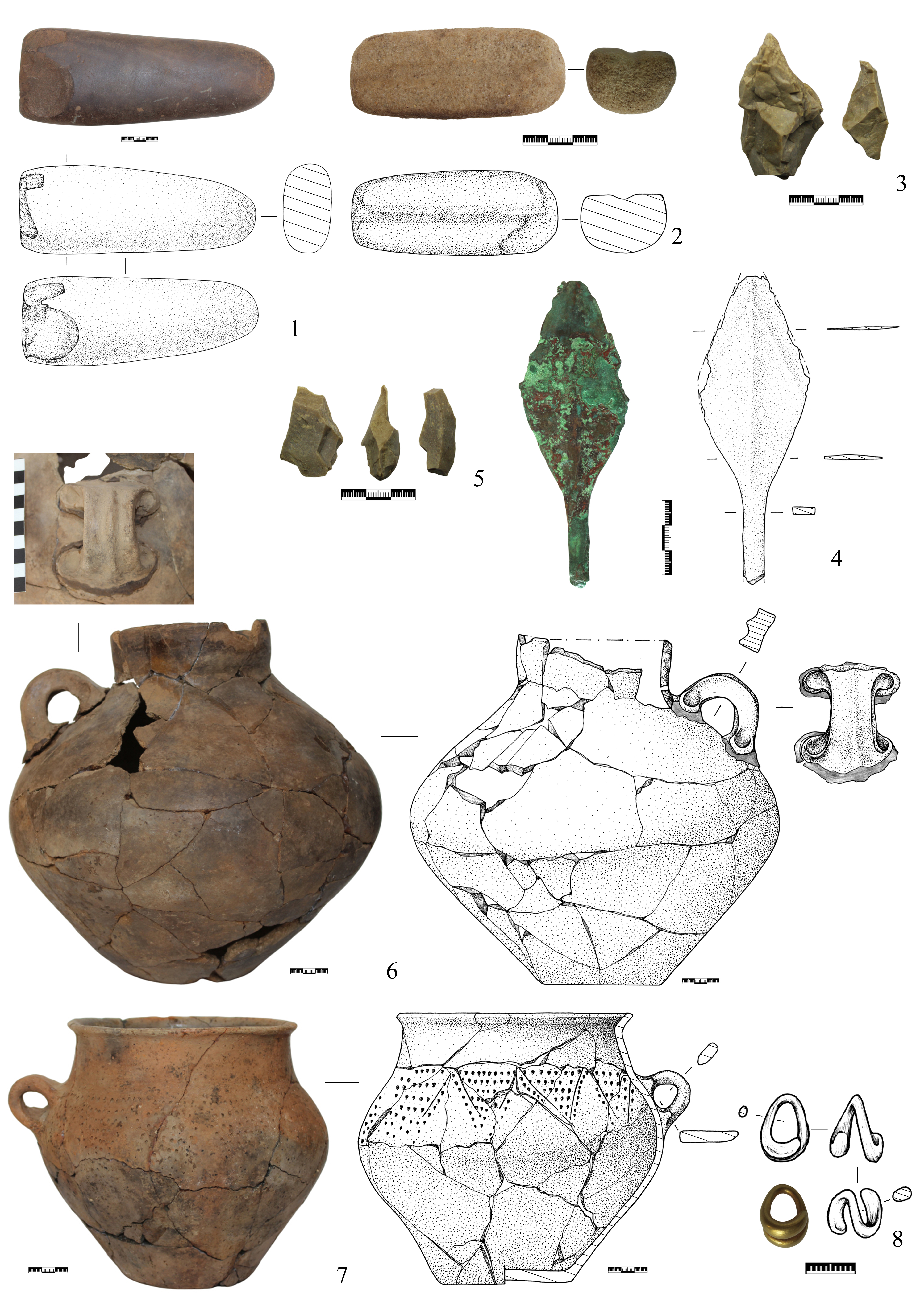 2. К юго-востоку от горшка, вплотную, на глубине –1,66 м от 0 находился небольшой лепной, коричневоглиняный сосудик реповидной формы с орнаментом по плечикам и небольшой петлевидной ручкой на плечике (рис. 5, 8). Венчик вертикальный, незначительно отогнут наружу. Высота венчика – 0,7 см. На плечике, ниже венчика к ребру тулова крепится примазыванием петлевидная, расширяющаяся к креплениям ручка с уплощенной верхней площадкой, на которой в виде штриховки изображены 3 диагональные линии, пересекаемые под острым углом другой линией. Высота ручки – 1,5 см. Поверхность сосуда коричневая, нижняя часть тулова подлощена и имеет слегка сероватый оттенок. Высота сосудика – 4,2 см, наибольший диметр тулова – 7 см, диаметр венчика по внешнему краю – 4,9 см, диаметр дна – 4,4 см. По плечикам, от ребра до венчика, верхняя часть тулова покрыта орнаментальным фризом, ограниченным снизу – по наибольшему диаметру тулова, сверху, под венчиком – прочерченными горизонтальными сплошными линиями. Между линиями заключены несколько различных геометрических зон: две прямоугольных и одна трапециевидная зона штриховок, пересекающихся под прямым углом линий; прямоугольных и равнобедренных треугольников, направленных вершинами и вверх, и вниз, и заполненных продольными линиями и штрихами; трапецией, заполненной 9 вертикальными линиями. Высота сосудика – 4,2 см, наибольший диметр тулова – 7 см, диаметр венчика по внешнему краю – 4,9 см, диаметр дна – 4,4 см.
