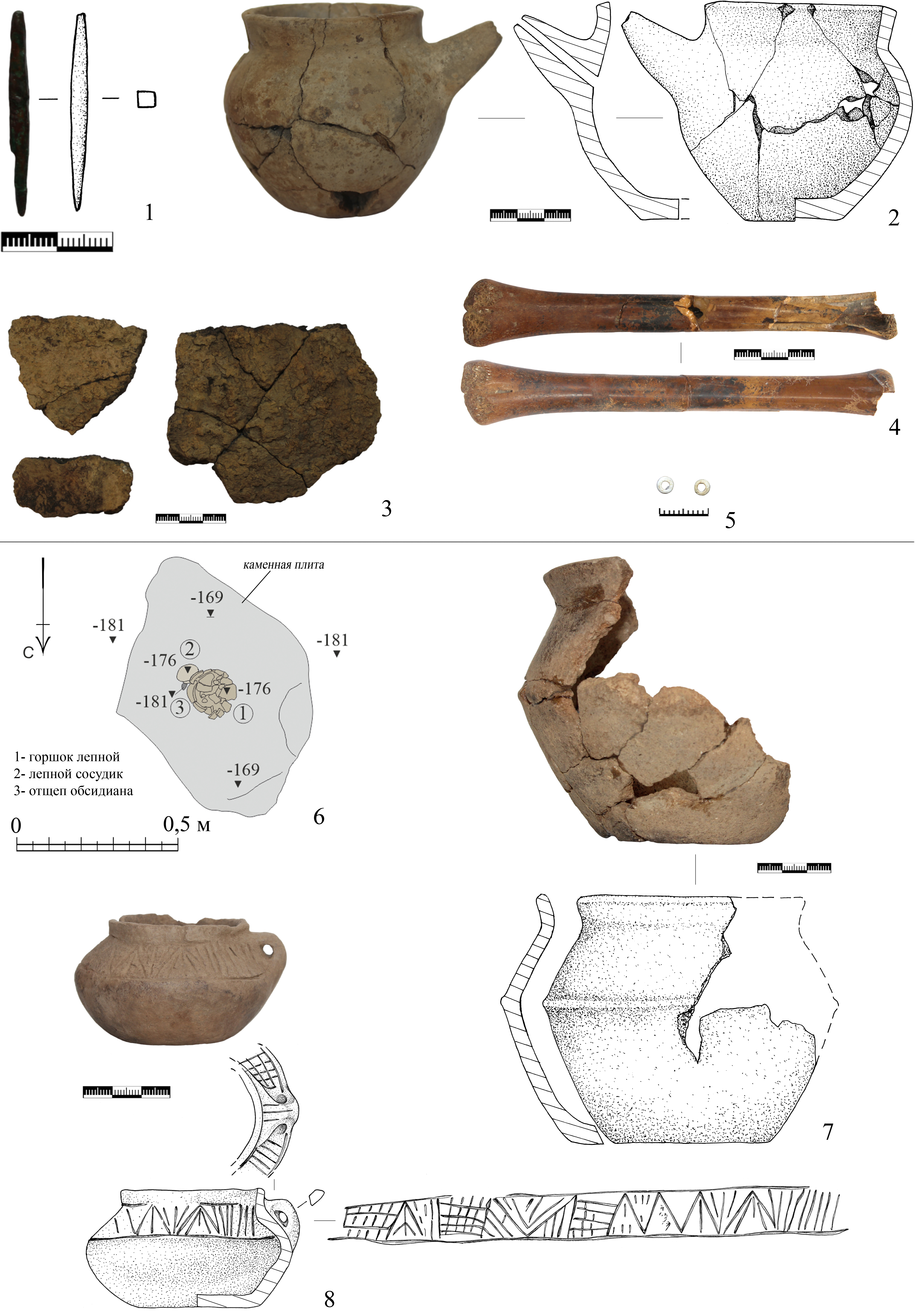 1. На расстоянии 20 см к западу от костяка на дне стоял лепной, коричневоглиняный горшок, вероятно, с уплощенным дном и с петлевидной, расширяющейся к креплениям, ручкой на плечике (рис. 6, 2). Тулово яйцевидное, с выделенным небольшим уступчиком в верхней части тулова. Ручка петлевидная, сужающаяся к центру, и приостренная кверху. На месте перегиба ручки имеется небольшая продольная ложбинка. Поверхность сосуда коричневая, с красными пятнами на плечиках и венчике и пятнами нагара у дна, хорошо залощена. В тесте фиксируется примесь дресвы. Высота сосуда – 13,5 см, наибольший диметр тулова – 15,3 см, диаметр шейки – 11,2 см, диаметр венчика – 11,8 см, диаметр дна – 6 см.