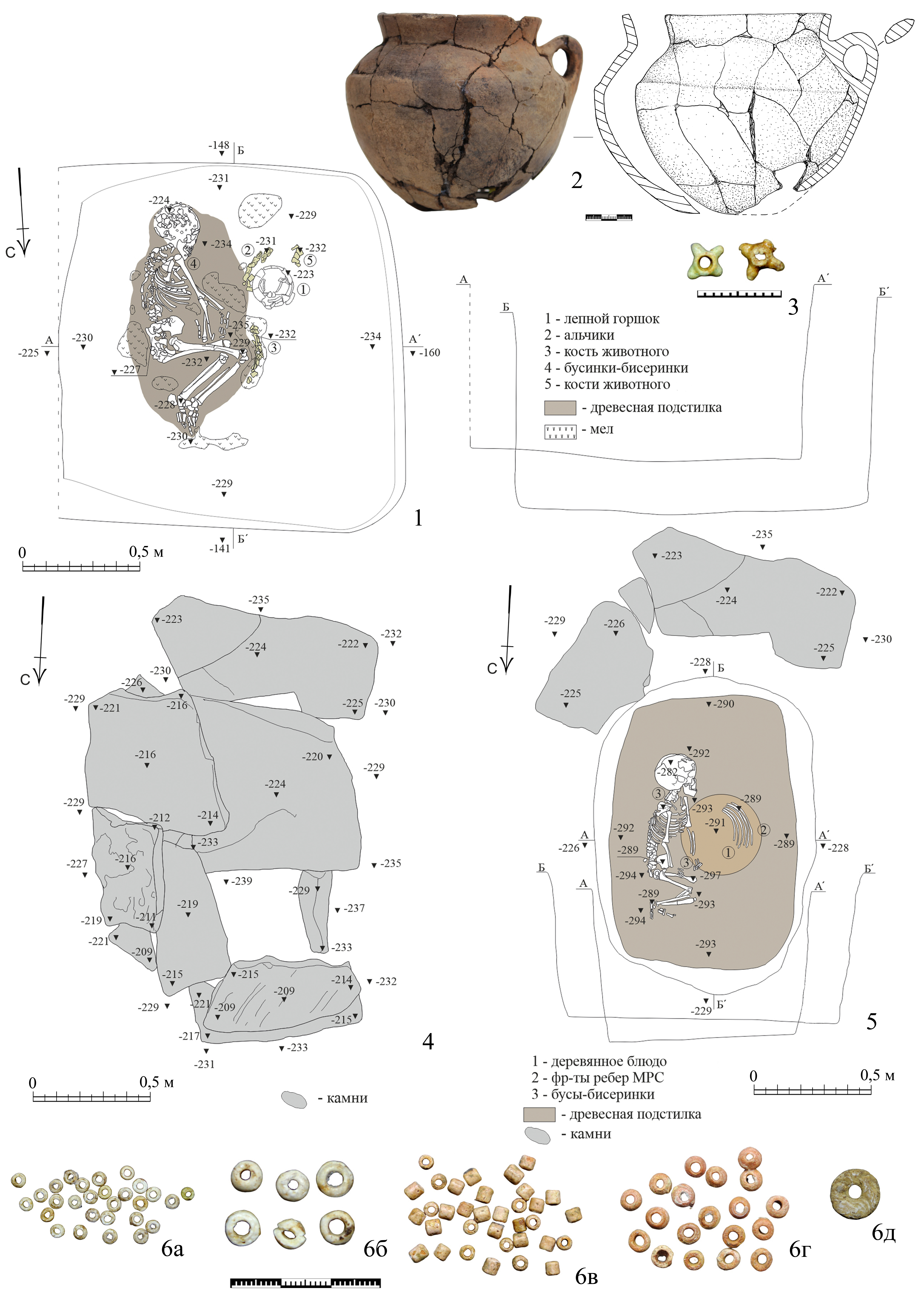 Обнаружено на уровне погребенной почвы на расстоянии 8 м к югу (180°) от ЦР. На этом же уровне зафиксированы перекрытия в виде деревянных плах в два слоя, уложенных перпендикулярно. Могильная яма подквадратной формы, ориентированная стенками по сторонам света. Размеры ямы по верху: длина – 1,47 м, ширина – до 1,54 м; размеры ямы по дну: длина – 1,43 м, ширина – до 1,51 м. Глубина ямы – до 2,35 м от 0 (рис. 6, 1). На дне ямы, немного восточнее оси С-Ю, был обнаружен костяк ребенка 7,5–8 лет, уложенный в скорченном положении на левом боку, головой и позвоночным столбом к югу. Руки были вытянуты вдоль тела, кистями к бедренным костям. На дне могильной ямы, вокруг костяка зафиксирована подстилка коричневого цвета древесного происхождения (?). На отдельных участках под древесным тленом зафиксированы пятна мелового посыпки толщиной до 0,5 см.
