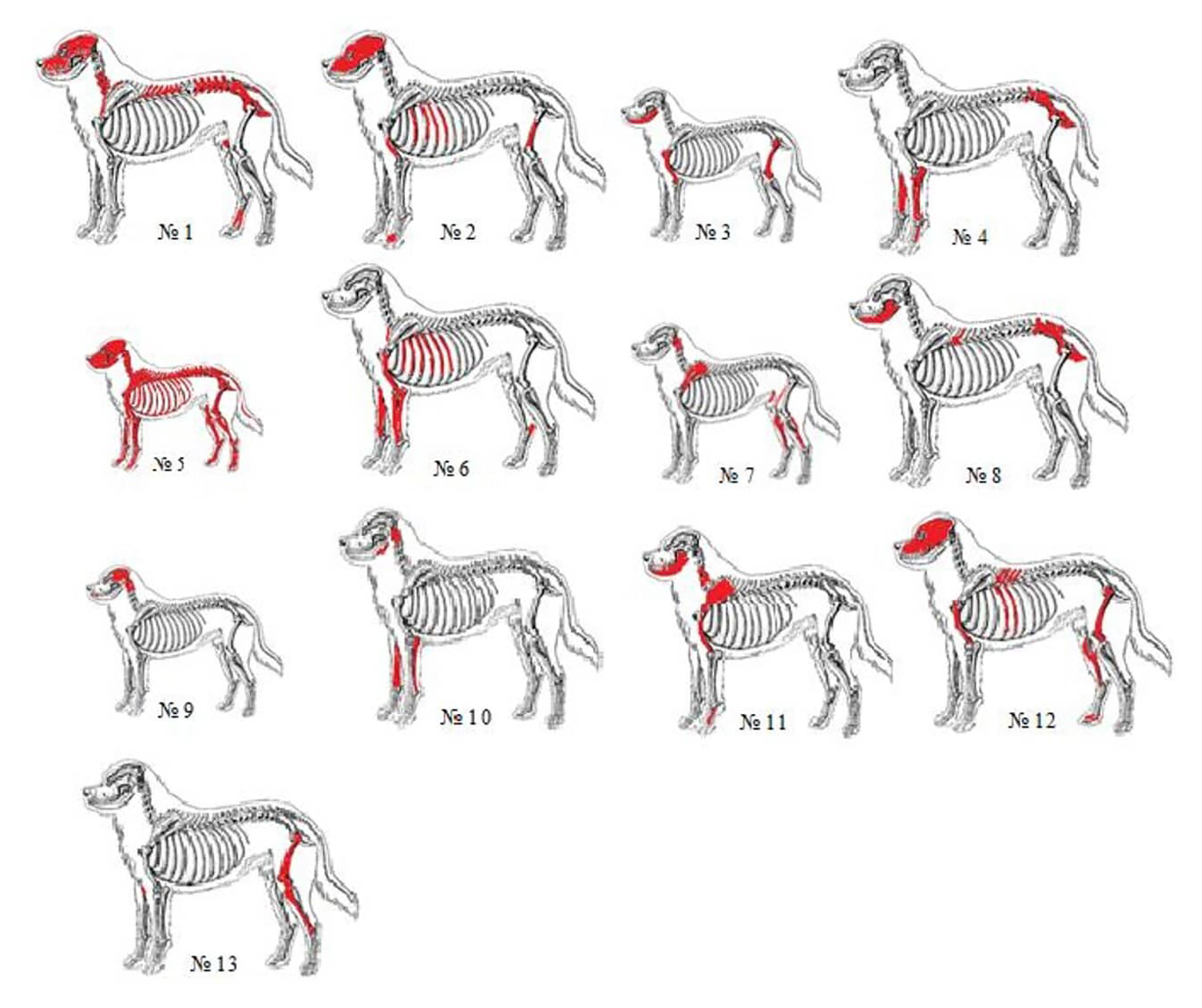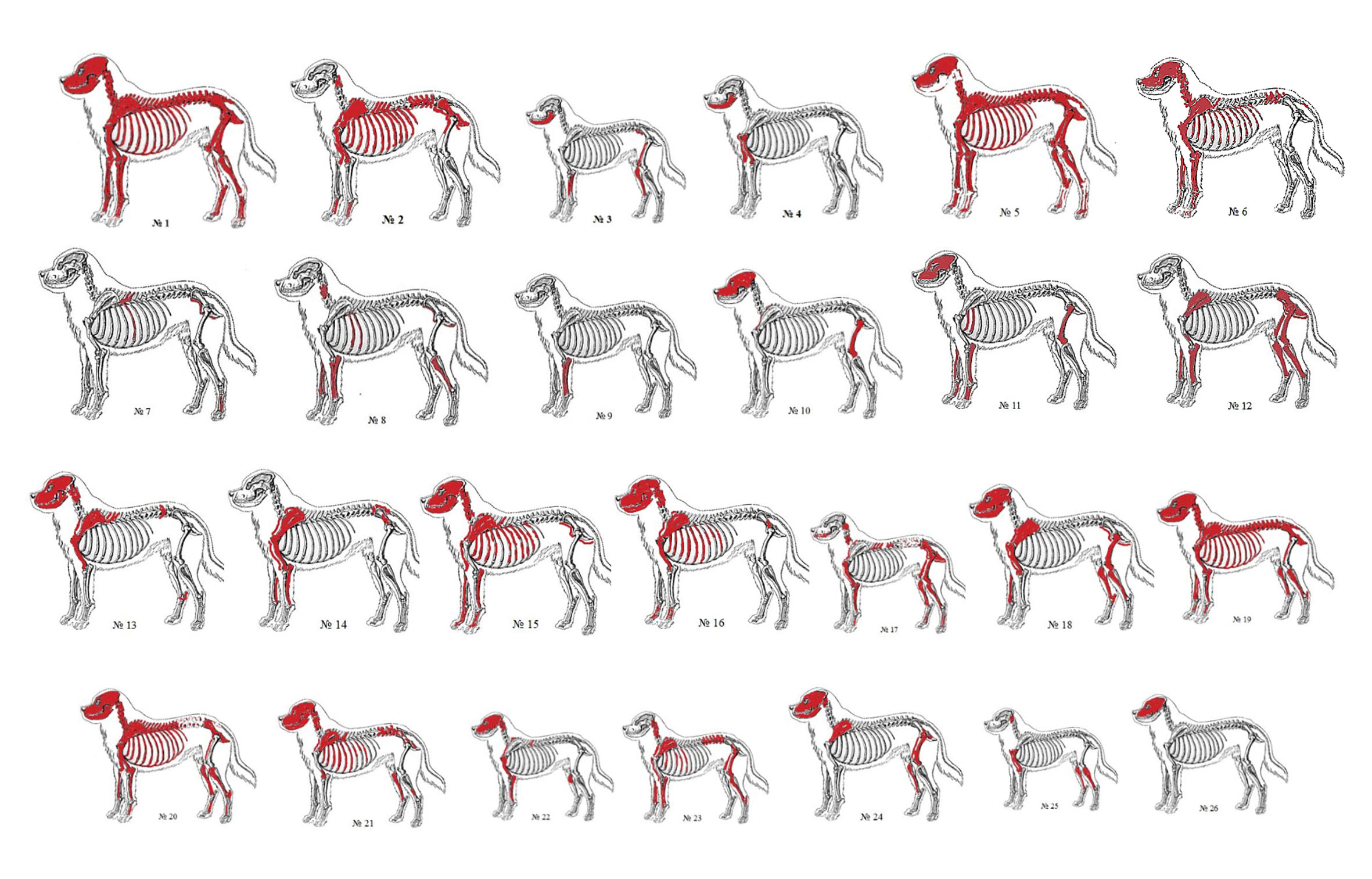 В яме 2, участок 2 кости собак целые, не раздроблены. Представлены почти все кости скелета (рис. 5). Отсутствуют некоторые мелкие кости: предплюсневые и запястные и третьи фаланги, но это мелкие кости, их не всегда выбирают из грунта. Сложно было точно соотнести какие кости принадлежали какой конкретной особи. Разбор на особи проводился с учётом местонахождения, размеров, наличия или отсутствия синостозов трубчатых костей. Ответить на вопрос, где находятся остальные кости, проблематично.
