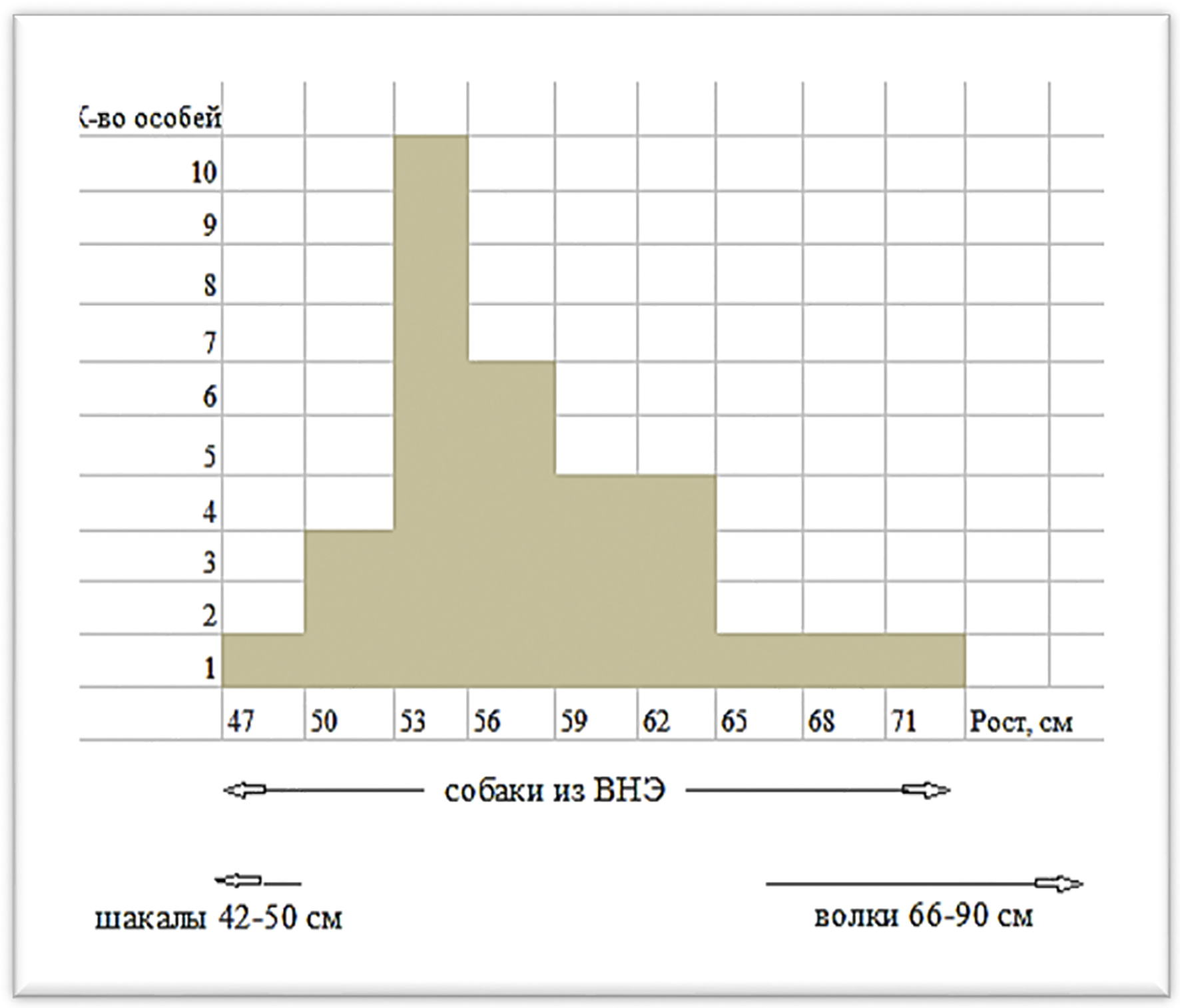 – промеры костей и рост этих собак в холке варьируют в большой степени (рис. 6). Такое большое варьирование размеров костей характерно только для домашних животных, особенно при бессознательном отборе. Вызывает сомнение в определении вида двух самых крупных особей, размеры которых соответствуют размерам некрупных волков. Вместе с тем собаки содержались, вероятно, достаточно свободно, поэтому возможно скрещивание собак и волков. На рис. 7 приведены черепа самой крупной собаки № 1, средней по размерам № 6 и самой маленькой собаки № 21. Эти же собаки отмечены под такими же номерами (№ 1, 6 и 21) на рис. 5 и рис. 8.