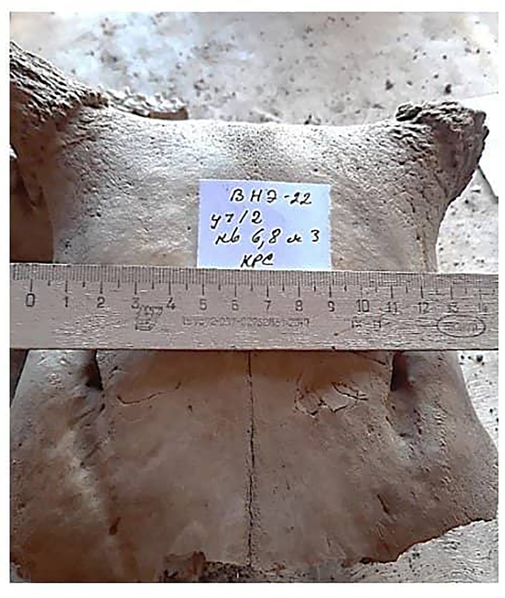 На участке 12, в яме 3 обнаружен крупный фрагмент черепа с прямым междурожьем и некрупными рогами (рис. 9). На участке 82 в сооружении 2 обнаружены череп и дистальные части конечностей крупной особи, предположительно быка домашнего. Точное определение вида затруднено, так как череп был сильно раздроблен. Все кости принадлежали особи в возрасте примерно 18–28 месяцев (М3 не прорезался), диафизы метаподий ещё не срослись с дистальными эпифизами, то есть рост костей животного ещё продолжался.