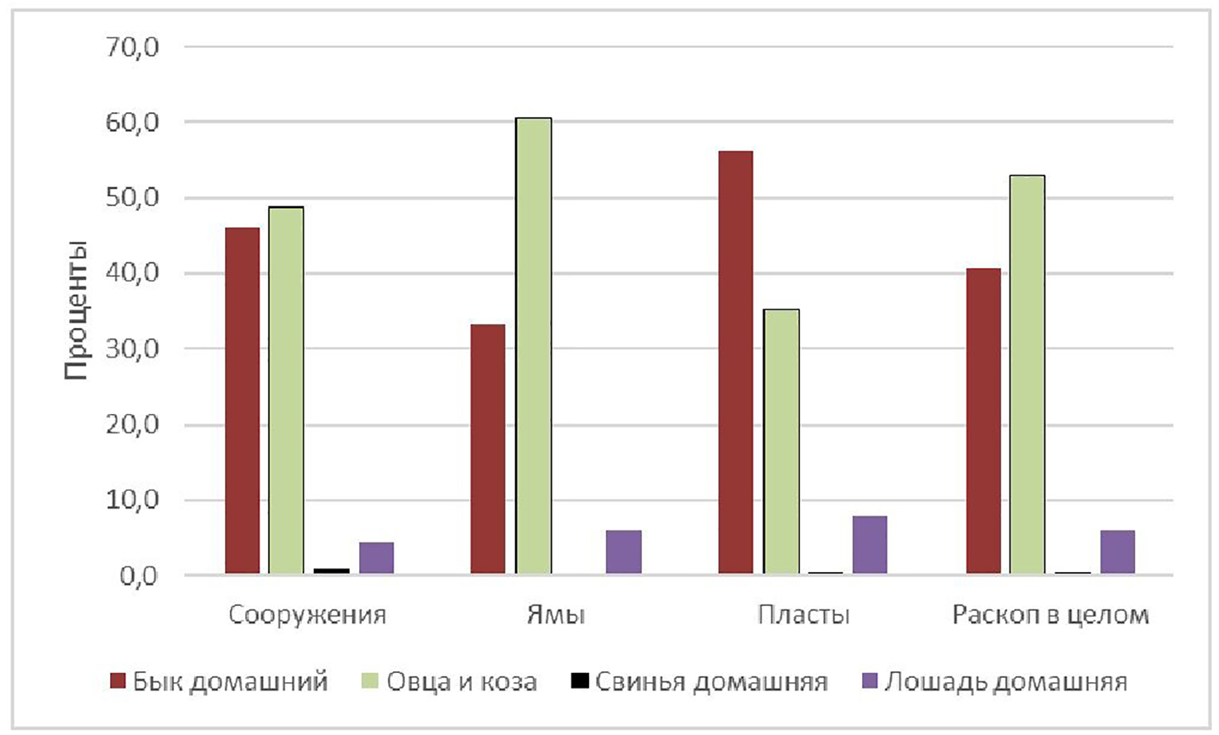 Некоторый интерес представляет работа Я.В. Березина и А.К. Швыревой о фауне поселения Энергетик II–Ш вв. н.э. в окрестностях Пятигорска [4]. Авторами отмечено значительное количество костей крупного рогатого скота, но следует отметить, что в процессе предварительной сортировки было отброшено большое количество костей, что могло существенно исказить реальную картину.