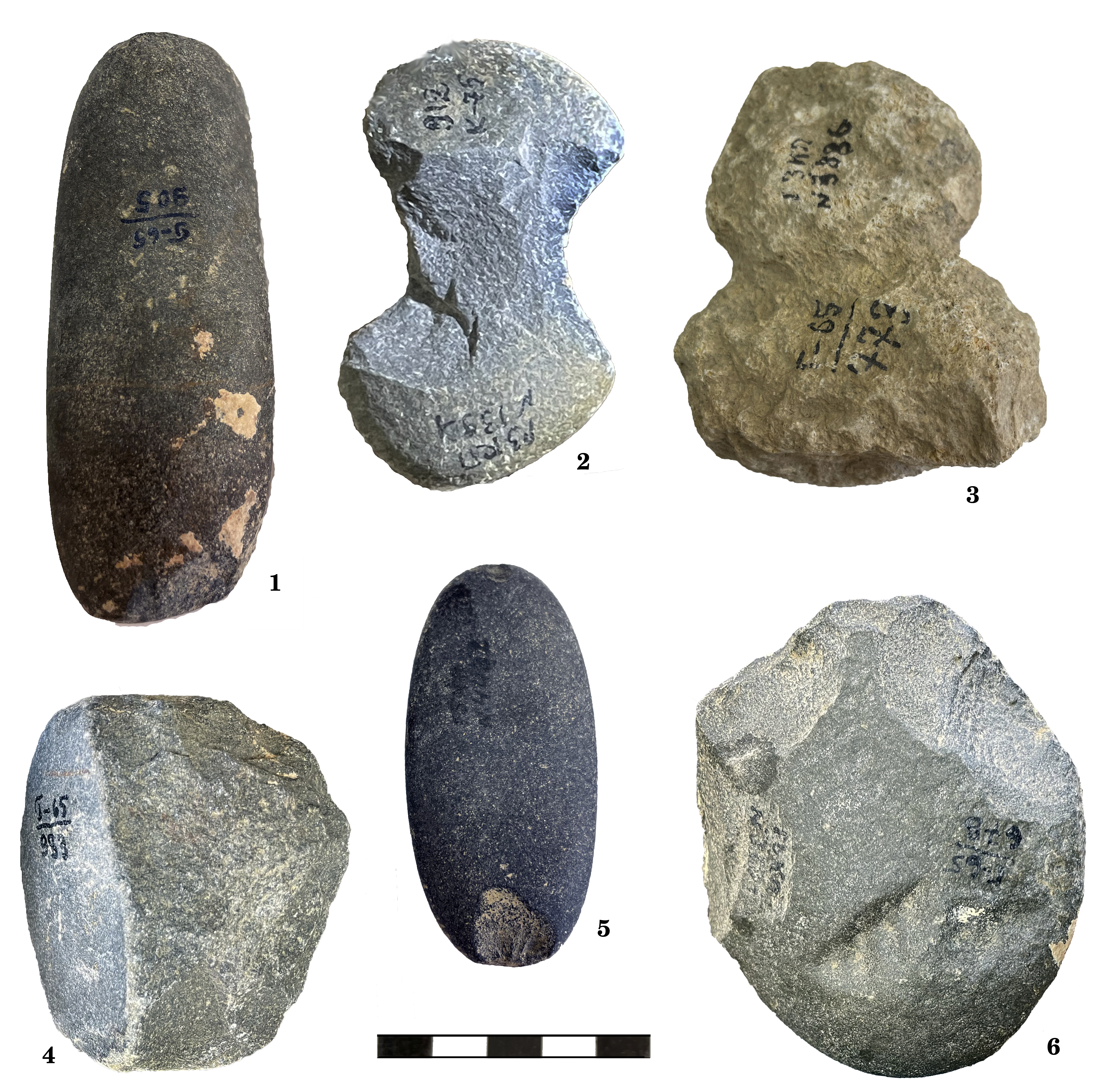 A large number of tools in the collection are made of pebbles. These tools functionally belong to various groups: choppers (Fig. 5, 4, 6), tools, used for rigging fishing nets (sinkers) (Fig. 5, 2-3), used in knapping and, possibly, retouching of stone tools (hammerstones (Fig. 5, 1, 5) and retouchers).