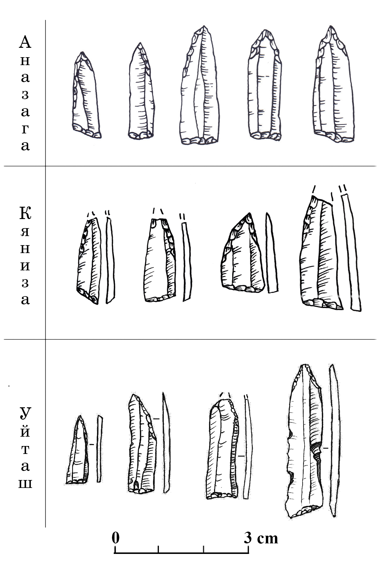 The main feature of the stone inventory of the Anagaza site is the presence of the Uytash points4 in it, which, in a functional sense, are flint arrowheads. In the collection of Layer 2, these tools account for 57% of all items with secondary processing, and in Layer 3 – 83%, respectively.
